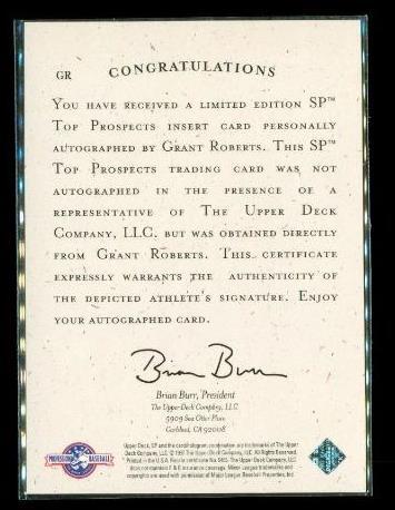1998 SP Top Prospects Autograph Card Grant Roberts #GR Auto Mets. All cards are original, raw and ungraded. No smoke or pet odors.