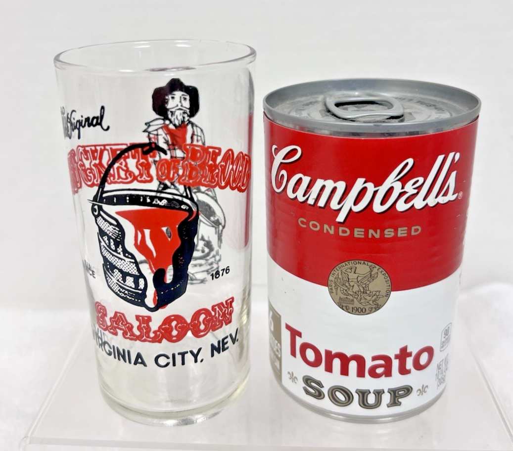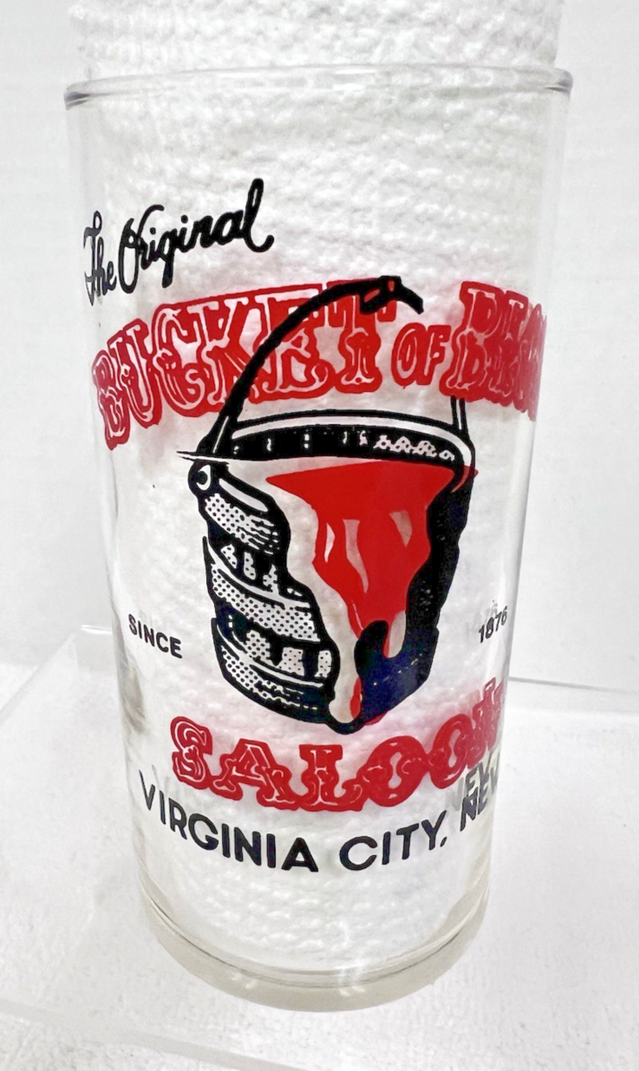 Vintage Original Buckets of Blood Saloon Virginia City Nev Gold Miner Prospector. Cute tumbler juice glass measures approx. 4 3/4" tall, front has bucket of blood black red coloring and backside shows a gold silver miner prospector. No damage or signs of use, clear logo. See pictures.
