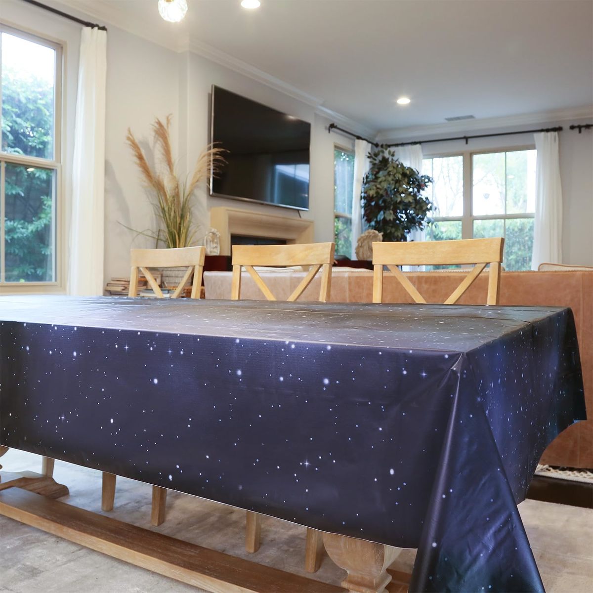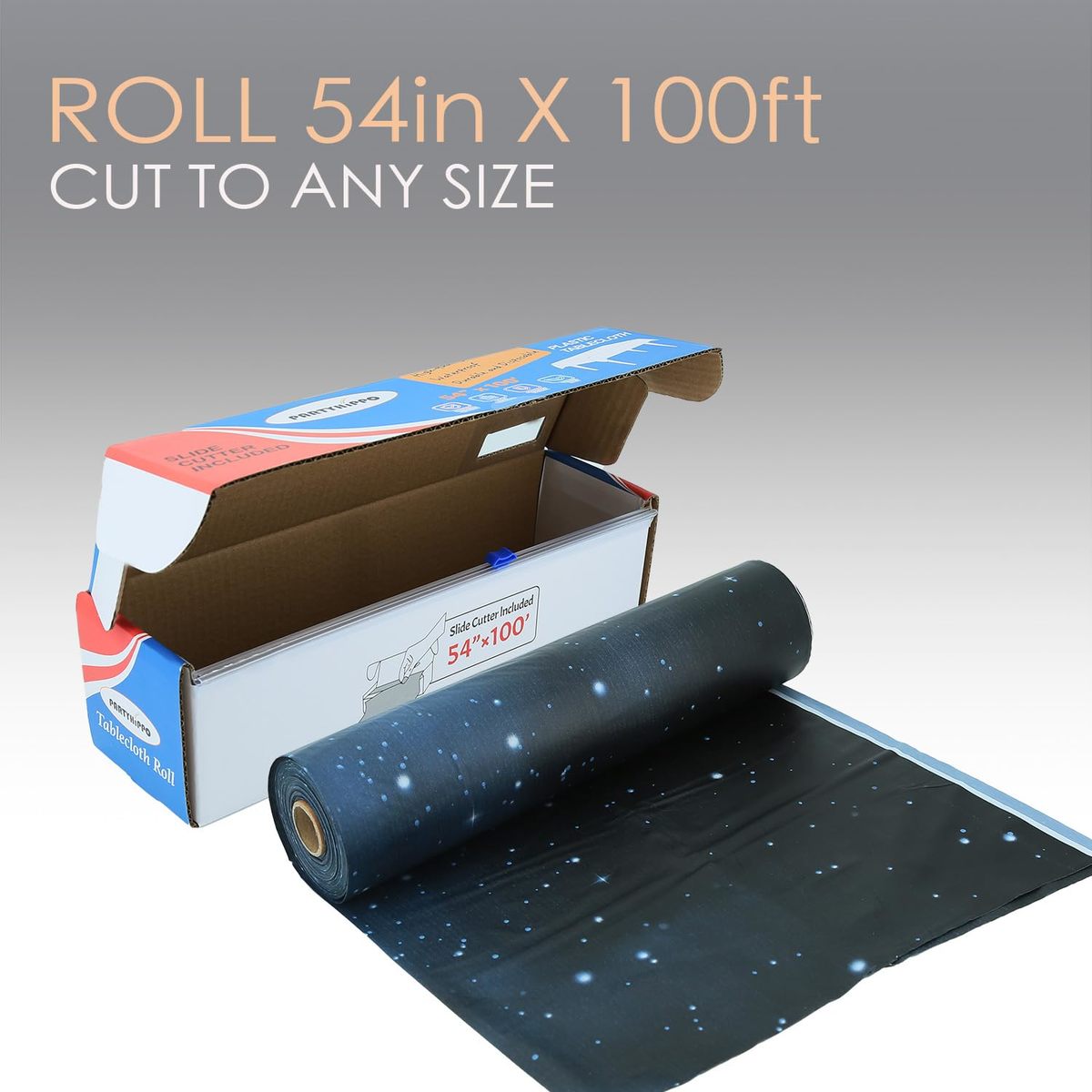 Cut to Any Size You Need ? Built-in sliding cutter lets you quickly customize the perfect length for rectangle, round, square, or oval tables. One roll covers multiple tables with ease.,Durable Waterproof Protection ? Made from heavy duty, wrinkle-resistant plastic that shields your table from spills, stains, scratches, and messes, keeping your event clean and stress-free.,Safe Odorless Material ? Crafted from non-toxic, BPA-free plastic with no chemical smell, making it safe for serving food and perfect for kids? parties or family gatherings.,Stylish Starry Sky Design ? Elegant navy background with shimmering gold stars adds a festive touch to weddings, birthdays, holiday dinners, picnics, and outdoor celebrations.,Quick Cleanup, Zero Hassle ? After the event, simply roll up and dispose?no washing, no ironing, no mess. Save time so you can focus on enjoying the moment.