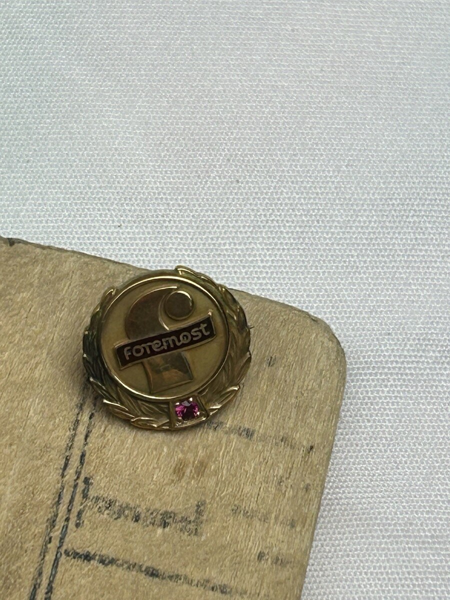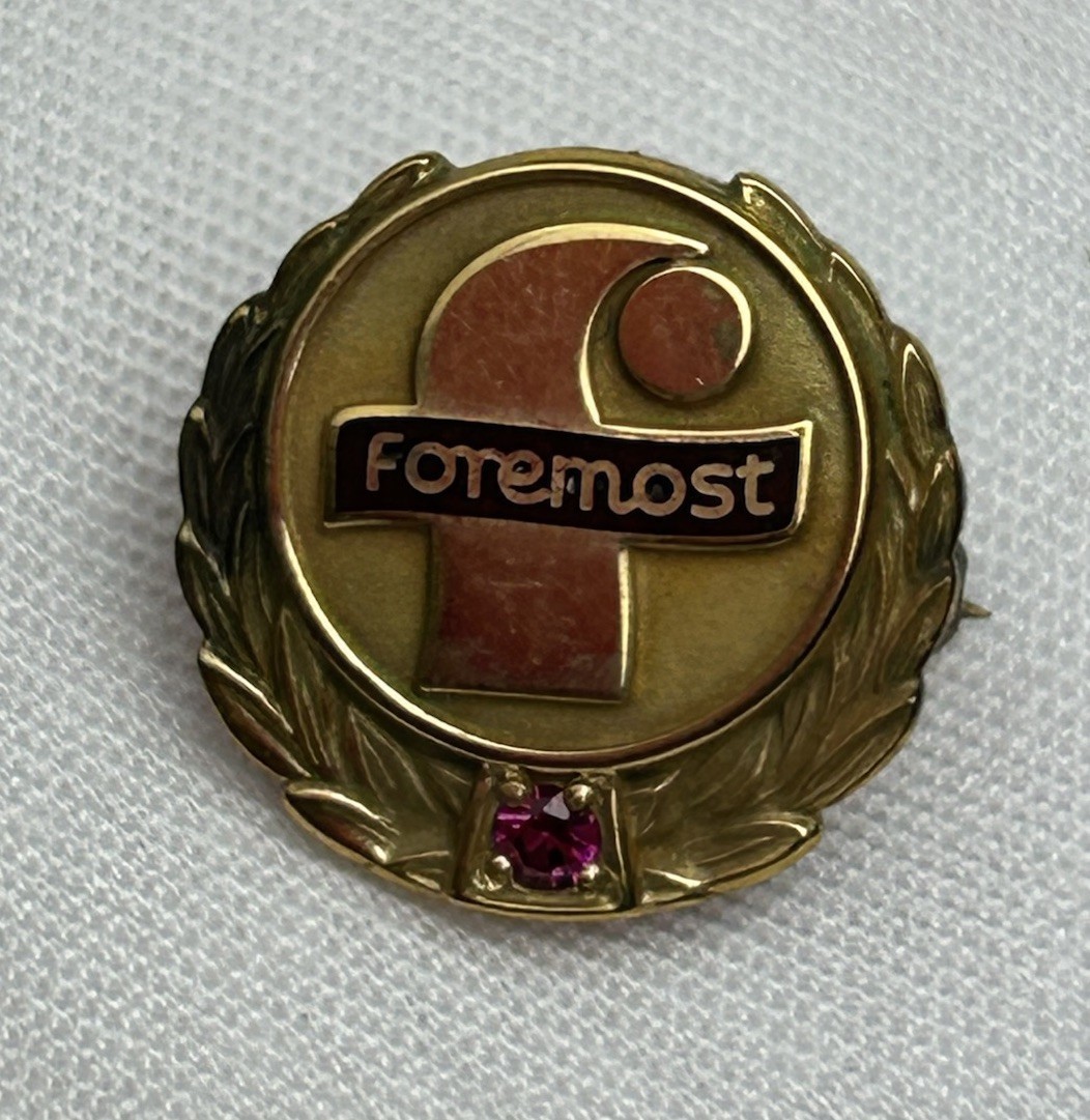 Vintage Foremost award or service pin featuring a round gold-tone design with laurel wreath detail and a pink/red rhinestone accent. Front is marked ?Foremost.? Back is stamped ?Monarch GF,? indicating gold-filled construction.