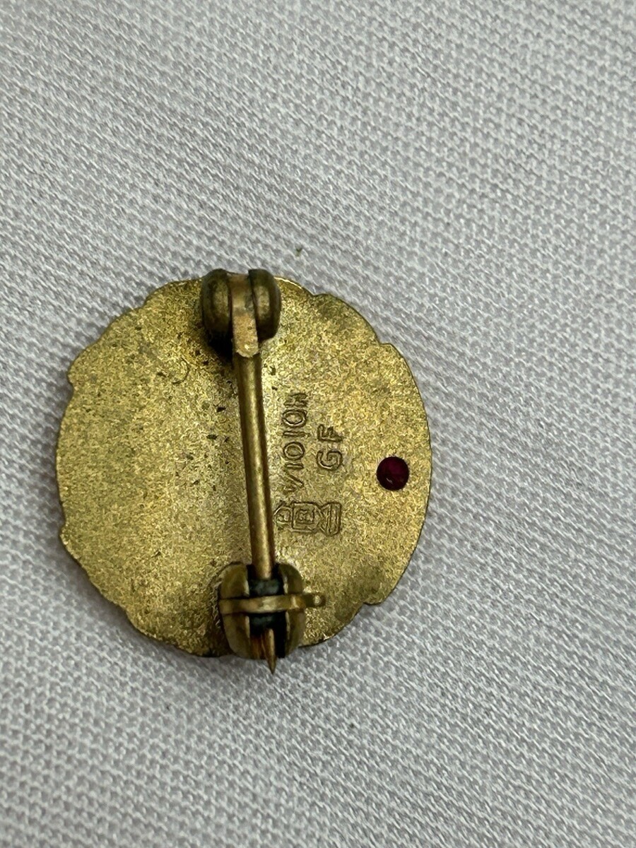 Good vintage condition. Shows age-appropriate wear including surface scratches, patina, and light discoloration on the back. Rhinestone is intact. Please review photos closely as they are part of the description.