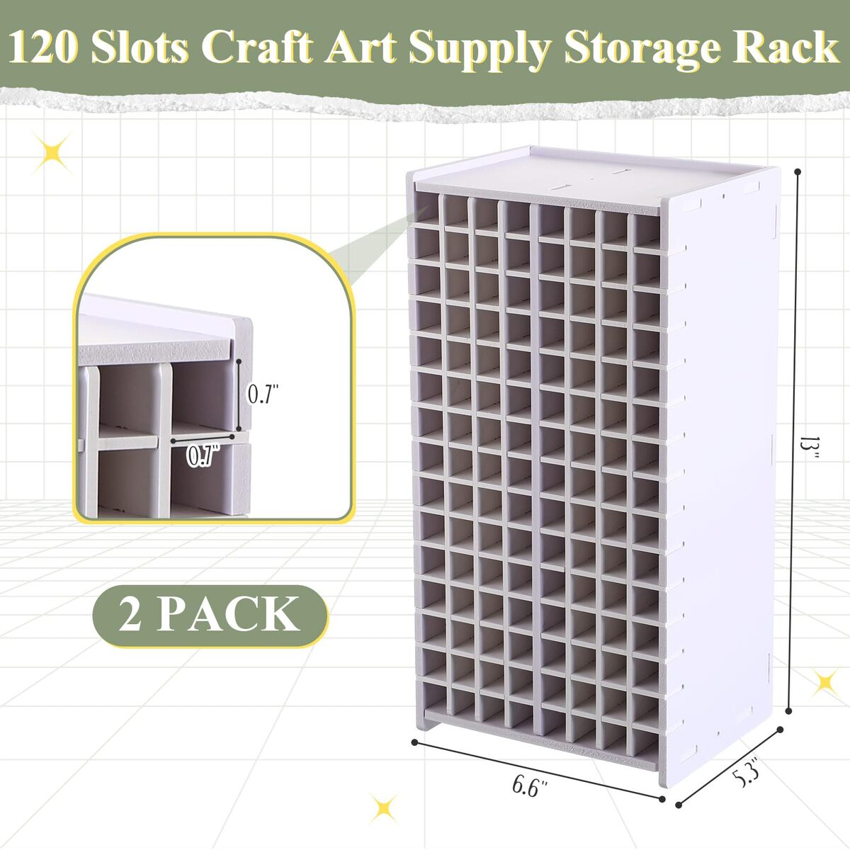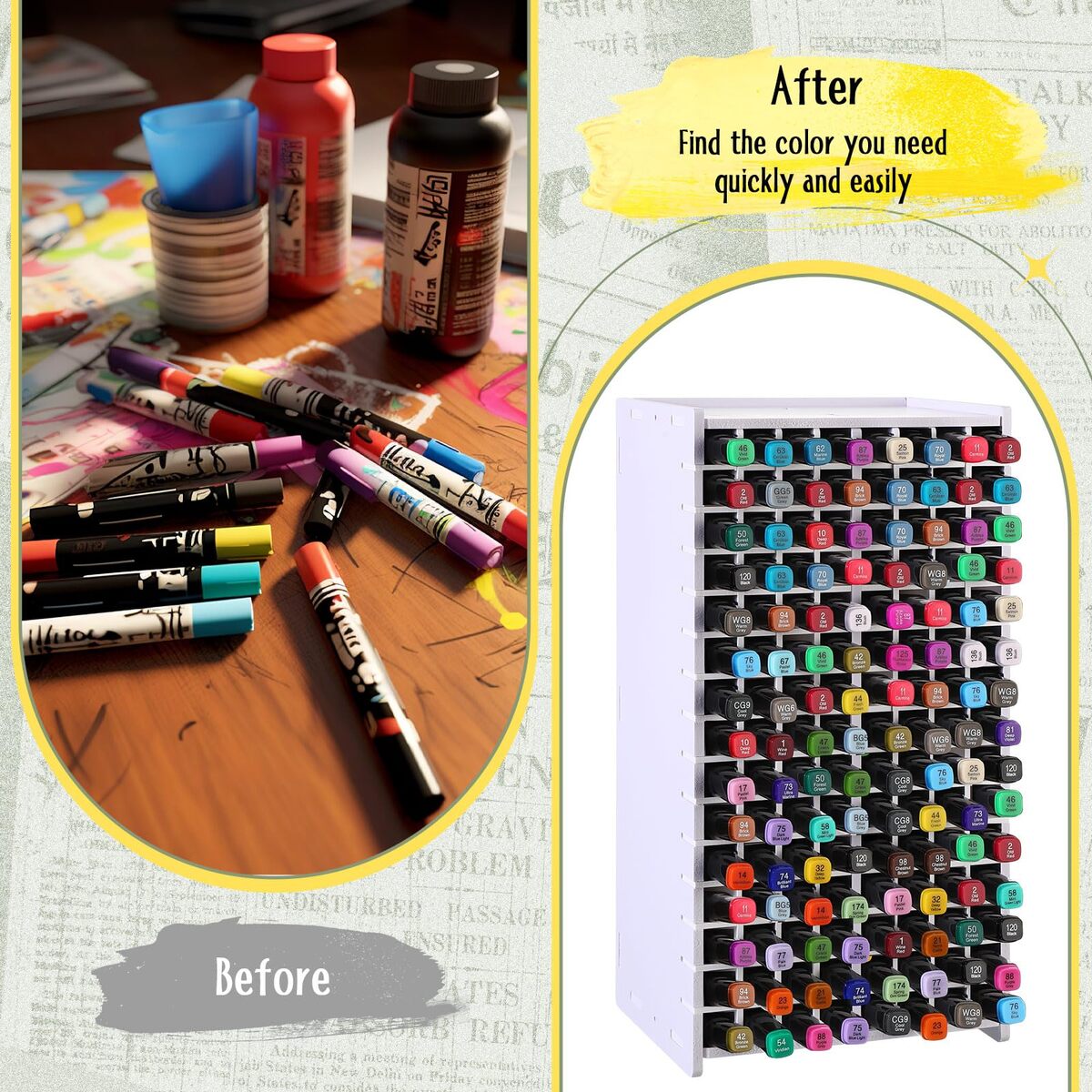 Massive Storage Capacity: with 120 slots capacity each, our pack of 2 marker organizers for desk can flawlessly hold up to 240 markers; Provides ample storage space for markers, colored pencils and other art supplies; With all colors at a glance, find the color you need quickly and without any hassle; This grand storage capability will help you easily categorize and access your markers for increased efficiency and productivity,Sturdy PVC Material, Easy to Assemble: our marker holder for desk is skillfully crafted from inner 3mm and outer 5mm thick PVC board; Their durability and strength ensure they can withstand daily use and wear; Please do not assemble the product violently; It is Easy to assemble with instructions, and no tools are required; When installing fragments, attach large holes first, so that the fragments can be arranged neatly and the installation time is reduced,Space Saving Design: measuring approximately 13 x 6.6 x 5.3 inches/ 33 x 16.5 x 13.5 cm each, and each hole is about 0.7 inch/ 1.8 cm, these compact marker holder organizers are specially designed to save space on your desk; With our art marker racks, you can optimize your workspace, keeps your art supplies within easy reach, and promotes a neat and organized environment,Adjustable and Removable Dividers for Your Convenience: our marker container features adjustable and removable dividers, providing you with the flexibility to customize your storage to suit your specific needs, suitable for storing irregular sized pens; Whether you need space for larger items or want to change your organization style, these dividers have got you covered; Multifunctional design ensures secure placement in a variety of ways to avoid items from falling out,Practical Gift Idea: these desk marker organizers make for a thoughtful and practical gift for birthday, Christmas, back to School; Whether it's for a student, artist, office worker, children and adults or art lovers, the recipient will thoroughly appreciate the convenience and organization this gift brings to their workspace; It promotes good organization habits and helps keep your desk tidy
