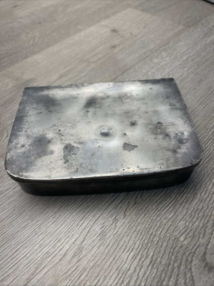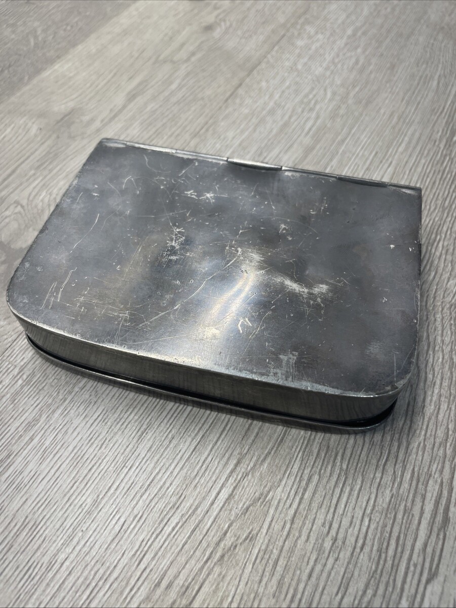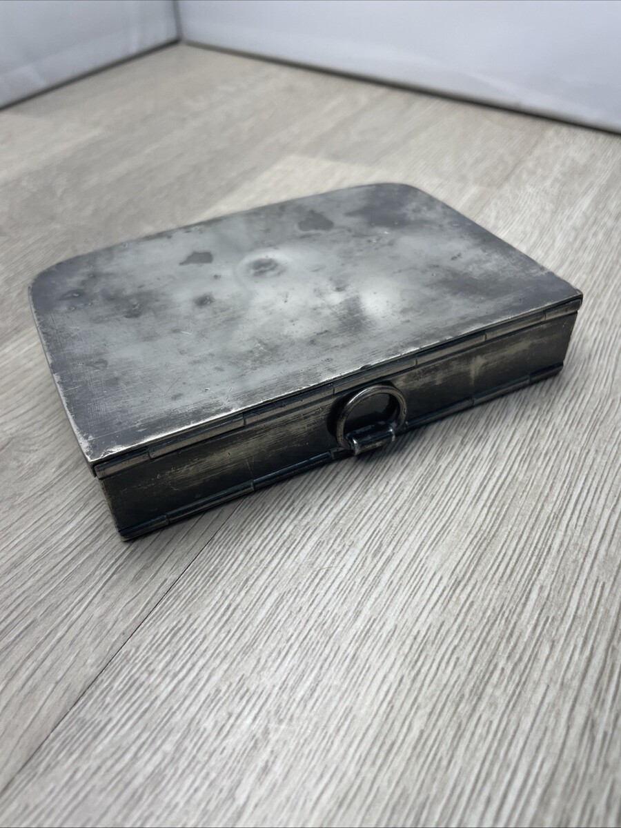 Preowned, good condition for age. Heavy, pewter maybe or another alloy, with some dents and scratches throughout. Hinges are in good working condition. See photos for more details.