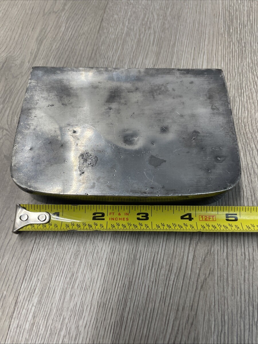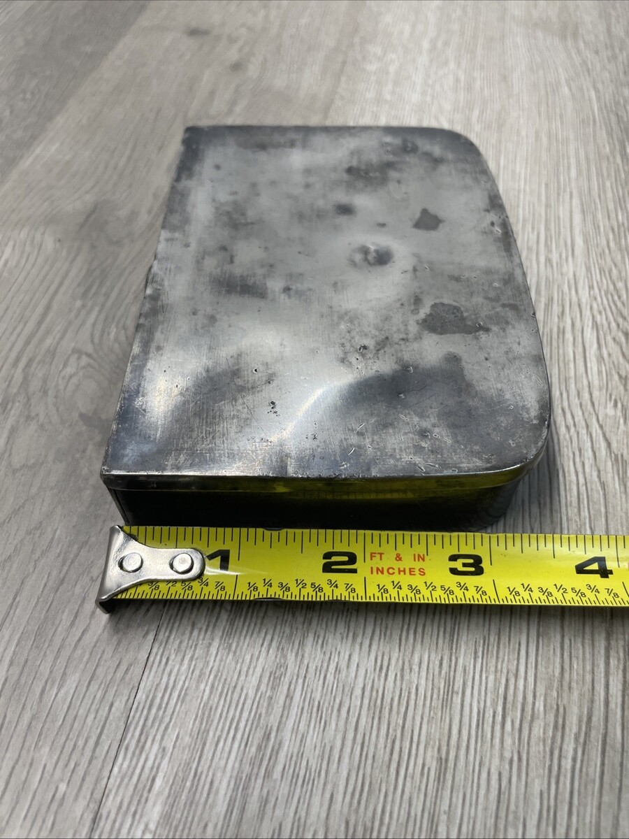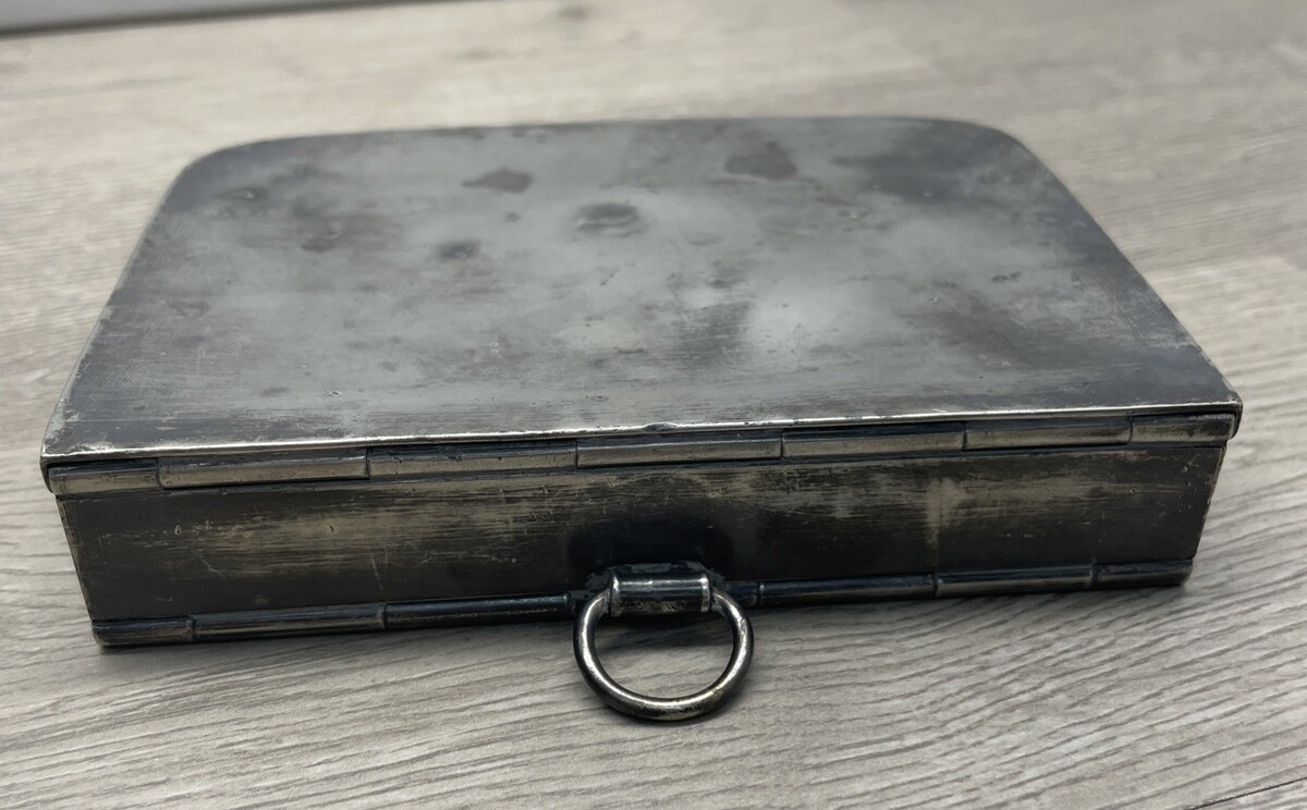 Preowned, good condition for age. Heavy, pewter maybe or another alloy, with some dents and scratches throughout. Hinges are in good working condition. See photos for more details.