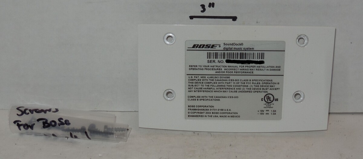 For sale is a Bose SoundDock Series 1 Digital Music System Replacement White Bottom Plate Screws. This Listing is For the Replacement White Bottom Plate Screws only No other accessories are included this is meant as a Replacement White Bottom Plate Screws for your original SoundDock. Its in Good Used condition as pictured. Tested and Works. What you see is what you will receive If its not Pictured its NOT included.. ask any and all questions prior to purchasing. Fast same or next day shipping with delivery confirmation.