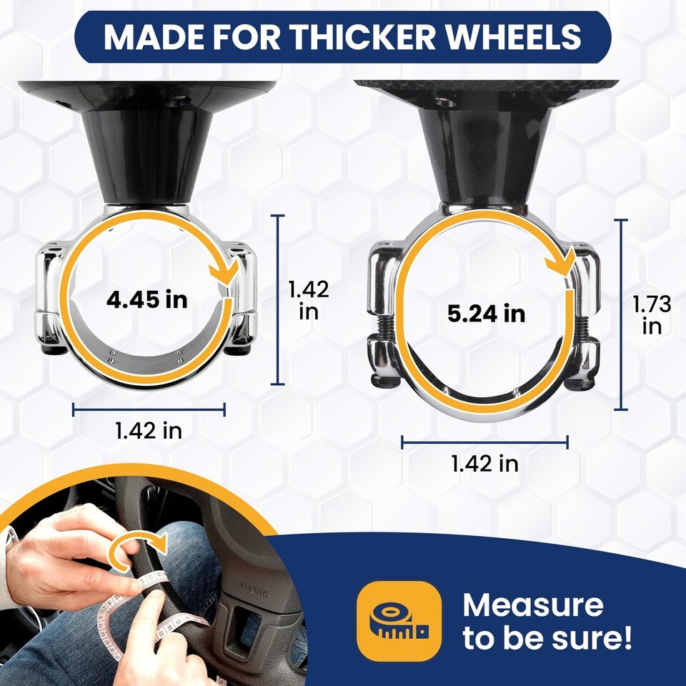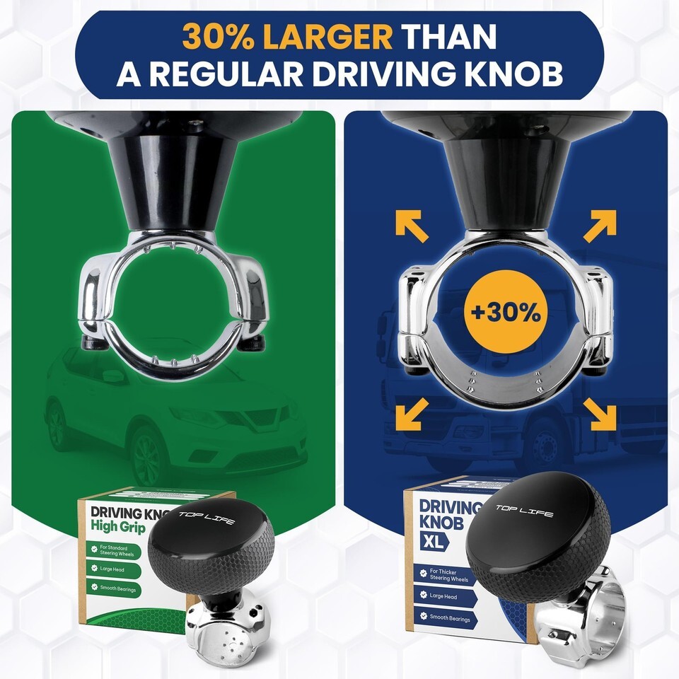 DESIGNED FOR LARGE DIAMETER STEERING WHEELS: Most steering wheel knobs are designed for cars. That's why they don't fit well on thick truck steering wheels. With its extra wide fit, this steering accessory fits on large wheels, making your maneuvers easy again.,HIGH-GRIP COATING: The silicone coating provides excellent grip and therefore better control. Its dimples and soft surface provide a pleasant feel. The anti-slippery coating prevents the knob from heating up in summer.,IDEAL FOR truck drivers, delivery drivers, chauffeurs and anyone who drives a thick steering wheel (sport steering wheels, vans, semi-trailers, etc.). Don't take the wheel without this driving aid.,FITS ALL STEERING WHEELS WITHIN THE DIMENSIONS of the extendable screw attachment (4.45" - 5.24"). Measure your wheel to be sure! The clamp is 1.42" wide (compared to 1.10" for our standard model). Protective rubbers are included to accommodate larger wheel diameters.,FLUID BEARINGS: We've chosen the best quality bearings for high fluidity. Since they take up no slack, you stay in control and maneuver safely. Easy assembly - everything is supplied, just follow the detailed instructions. 30-day money-back guarantee, order today!