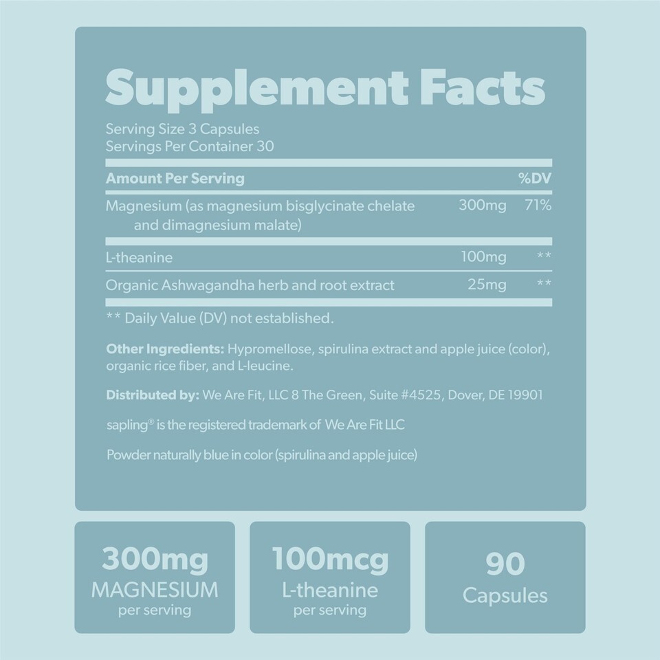 Magnesium Complex: 300mg of elemental magnesium sourced from chelated magnesium bisglycinate and dimagnesium malate, formulated for enhanced absorption and bioavailability.* Sapling Magnesium Complex does not contain less bioavailable forms like magnesium oxide.,More than just magnesium: Experience the combination of magnesium (magnesio), L-theanine and herbal support from organic Ashwagandha herb and root extract in our carefully crafted formula.,Easy on the stomach: Unlike other forms of magnesium, magnesium glycerinate can help to replenishing natural magnesium levels without causing stomach discomfort.*,Third-party tested: Each ingredient in this magnesium complex is carefully selected and third-party tested ensuring a high-quality product that you can trust.,For the planet too: For every product purchased, a tree is planted. We also are Plastic Negative, meaning with the help of our partners we remove more ocean-bound plastic from the environment than our packaging contributes.