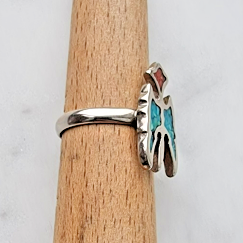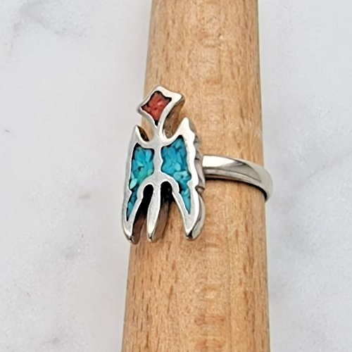 ZUNI VINTAGE 925 STERLING SILVER TURQUOISE AND CORAL THUNDER BIRD RING SIZE 5.5