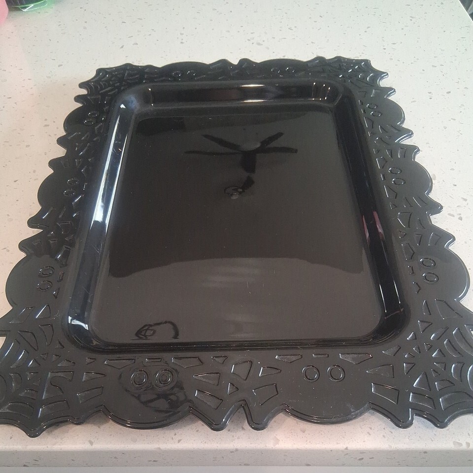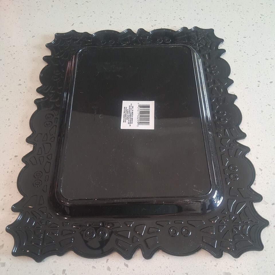 product is a plastic Halloween spider web serving tray imported by DTSC Imports. This unique tray is designed specifically for Halloween use, making it a perfect addition to home decor during the holiday season. The intricate spider web design adds a spooky touch to any table setting, making it both functional and decorative for Halloween enthusiasts looking to add a festive touch to their home.