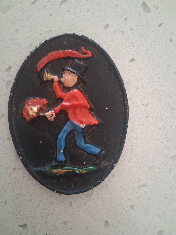 This small vintage firefighter fire insurance badge cast iron plaque measures 3 inches and has a theme of firefighting and rescue. It is a unique and collectible item that would make a great addition to any historical memorabilia collection. The plaque does not come signed, making it a versatile piece for display in a firefighter's home or a vintage decor setting. Its compact size makes it easy to showcase in a small space or as part of a larger display.