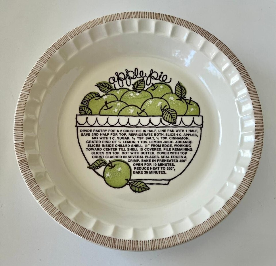 This vintage Royal China By Jeannette Recipe Deep Dish Pie Plate is an 11" round ceramic pie dish featuring a multicolor apple pie theme. Made in the United States in the 1980s, this oven-safe, microwave-safe, and dishwasher-safe pie plate is a collectible piece for any kitchen. With its classic design and original manufacturer, this pie dish is perfect for baking your favorite apple pie recipes with style and nostalgia.