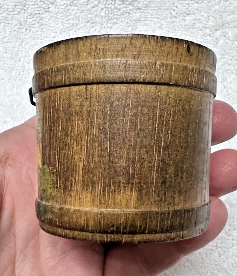 Older Hand Painted Miniature Wood Bucket Log Cabin Scene 2 inches the bucket is just shy of 2 inches and the handle stands 1 1/2 inches tall overall very nice shape