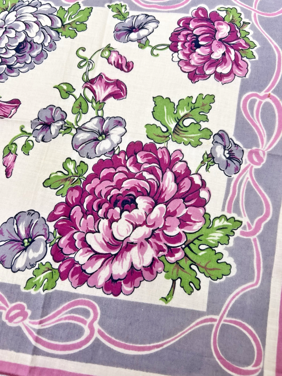 Vintage Hankie Purples Pinks Greys Chrysanthemum and Morning Glory 12 Inch In good shape no holes or stains We have several listed and can ship up to 20 hankies for the price of 1