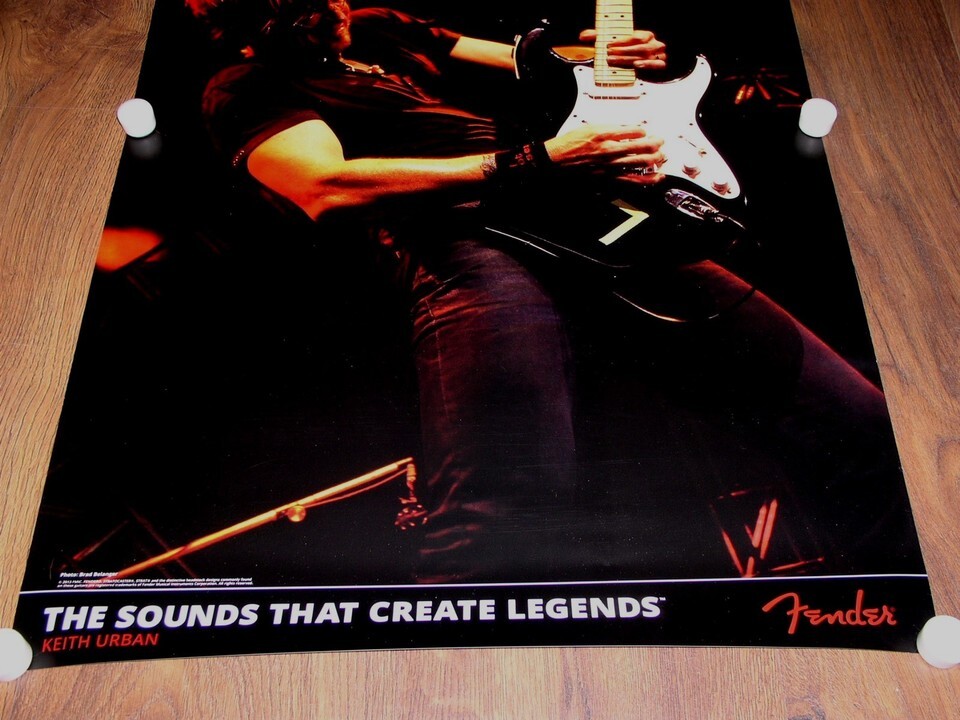 This is an original Fender guitar promo poster store display entitled, "Fender, The Sounds That Create Legends". Dated 2013 FMIC. Photo of Keith Urban. Photography by Brad Belanger. Printed on heavy stock paper, similar to photography paper. A terrific item for the fan or collector.