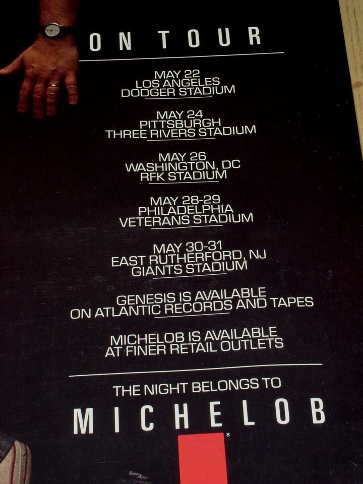 This is a vintage poster entitled, "Michelob Presents Genesis On Tour". May Dates listed on the front. A terrific item for the fan or collector. * This is not one of those new reproductions. It is vintage.