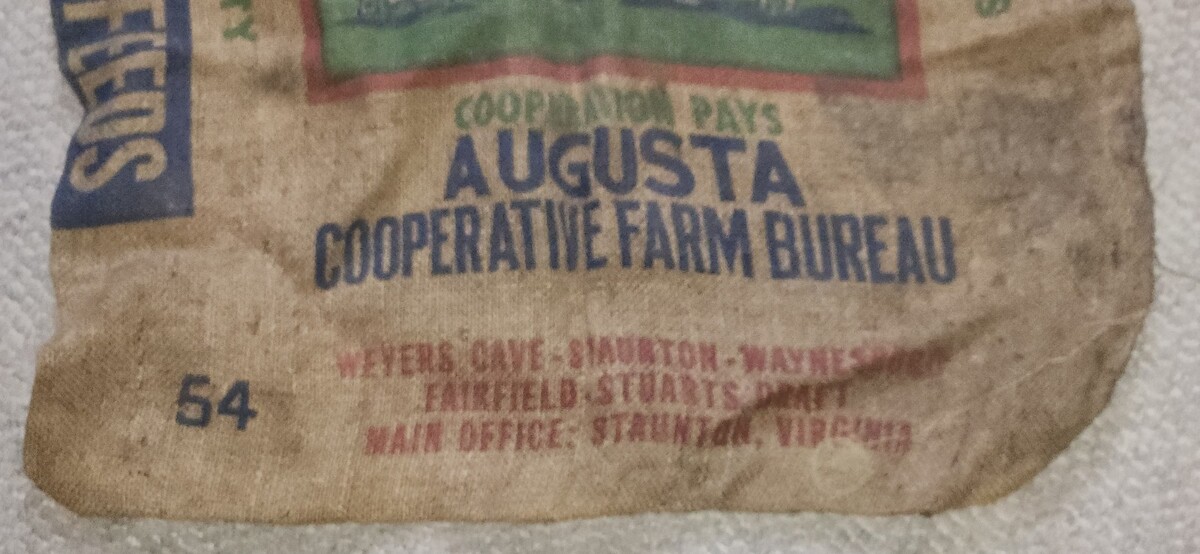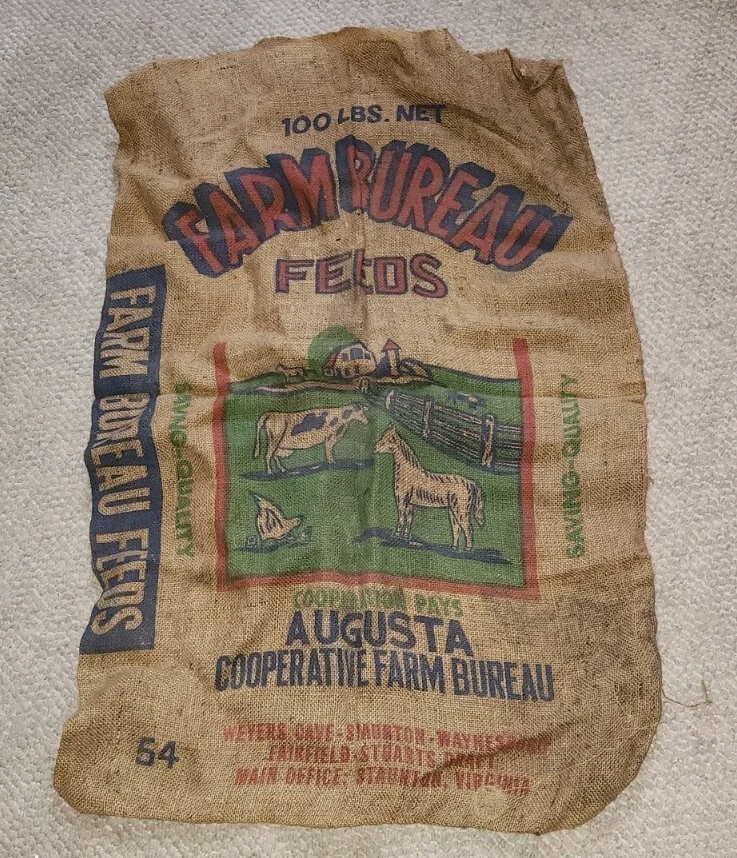 Here we have a vintage 100 pound burlap sack from Farm Bureau Feeds Augusta Virginia. . Has wear and soiling from age. Make a great wall decoration. Age is unknown.