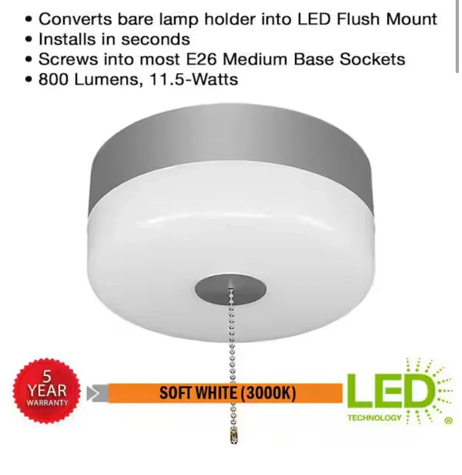 Commercial Electric 7in. Spin Light LED Flush Mount with Satin Nickel Accent and Pull Chain is designed to screw into most existing plastic and porcelain lamp holders without any wiring required. (Direct wire option is available using bracket included in box). Converts your lamp holder to a fixture in no time at all. For quick activation, use the pull chain for an easy grab. Great for closets, bathrooms, stairways, pantry, basement, garage, attic or laundry room.