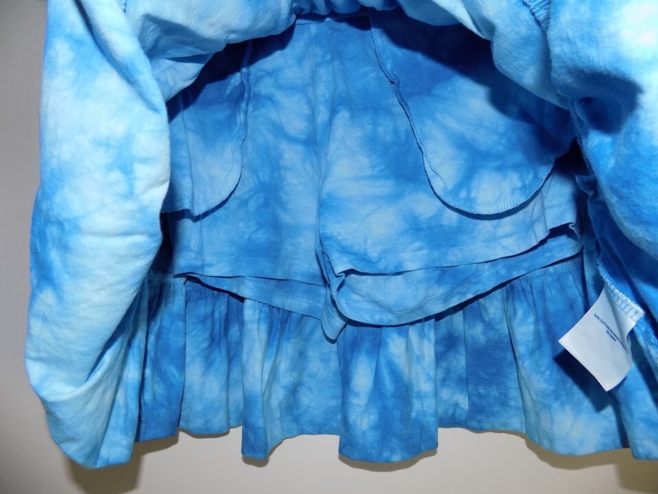 This Lands' End Tiered Blue Tie-Dye Print Skort is a stylish and comfortable option for girls size L (10/12). Made from 100% cotton knit fabric, this skort features a gathered style and comes with pockets for added functionality. The blue tie-dye print adds a fun and vibrant touch to any outfit, making it a versatile piece for any young girl's wardrobe.