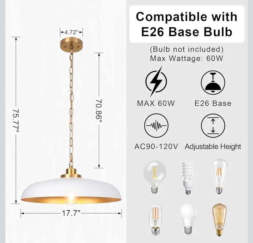 This elegant pendant light is ideal for dining tables, kitchen islands, hallways, bars, offices, and entrances. The white exterior paired with gold accents creates a warm yet modern aesthetic that complements farmhouse, industrial, and contemporary decor styles.