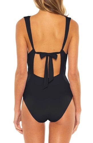 Spacer beads add drama to the rippling ruching of this plunging keyhole swimsuit with an open back secured by an adjustable tie.