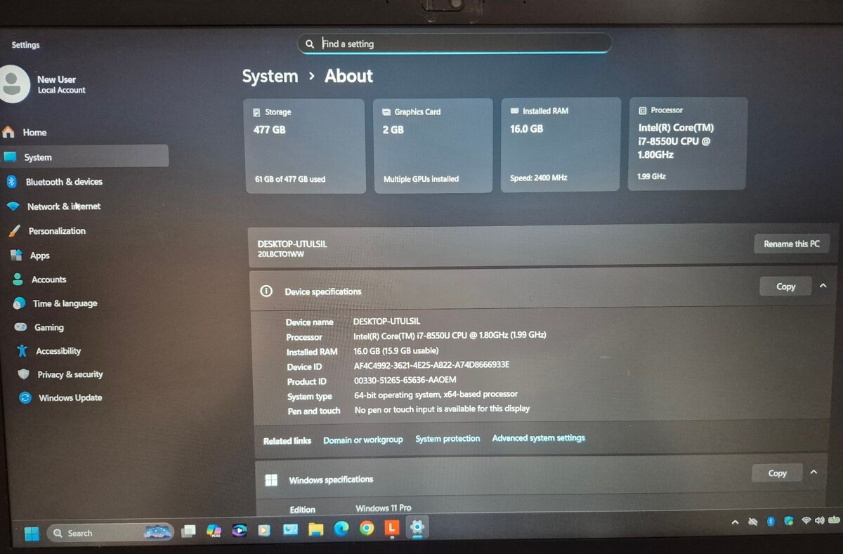 Intel Core i7 ~ 8550U @ 1.90GHz * 16GB Ram * 512GB SSD