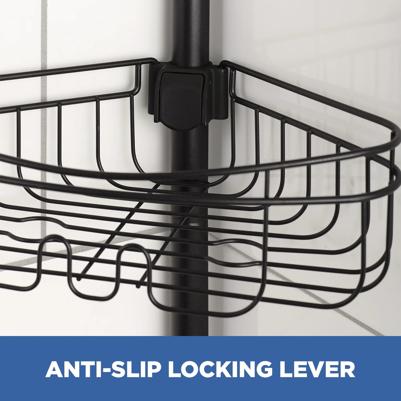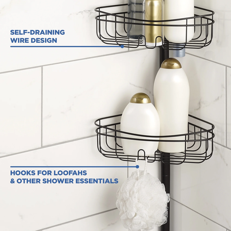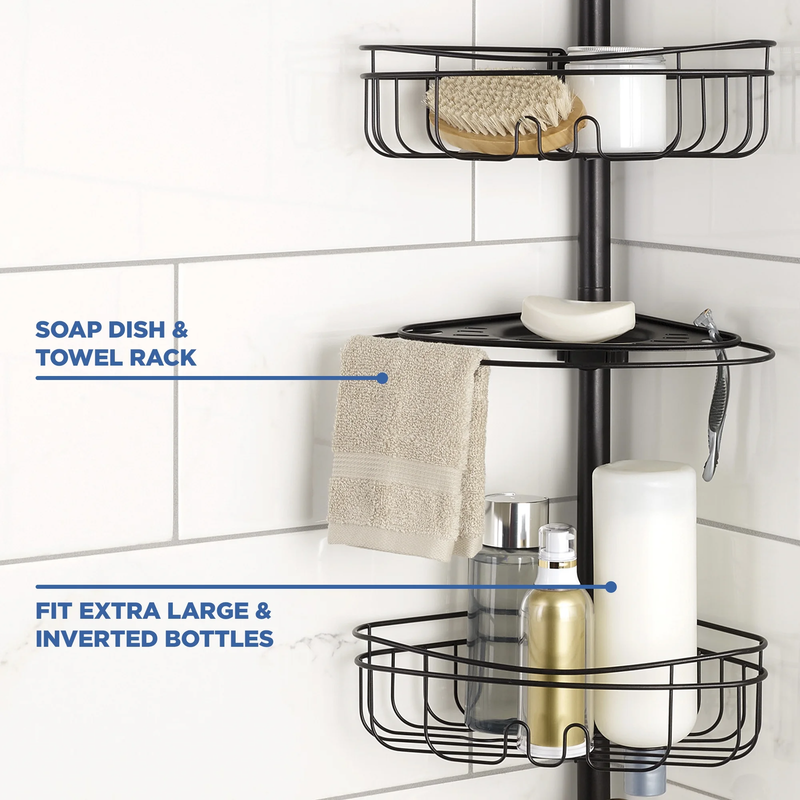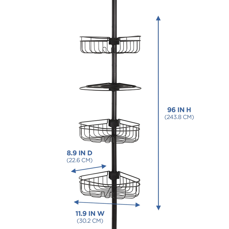 Mainstays corner shower caddy helps to organize your bath items and reduce clutter Pole caddy includes 3 adjustable deep storage baskets, plus a soap tray shelf with towel bar Sturdy construction; each basket holds up to 7.5 lbs Quick-dispense inverted bottle storage for easy dispensing of shampoo, conditioner and more Adjusts from 5 feet up to 8 feet, 1 inch high to fit in the corner of most standard shower and bathtub spaces Tension pole mechanism enables easy, secure and tool-free installation Oil-rubbed bronze finish is rust resistant Wire shelves allow water to drain so your toiletries dry faster