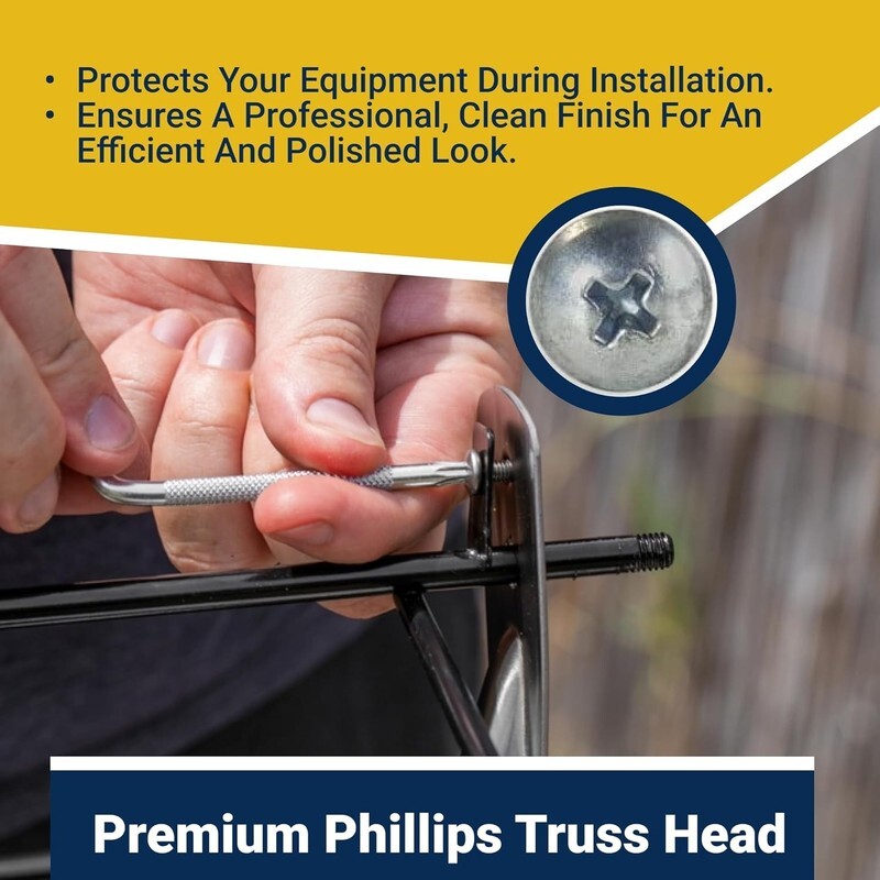 Phillips Truss Head Design: The Phillips truss head is designed to protect your equipment while providing a professional and clean finish, making installation both efficient and aesthetically pleasing.