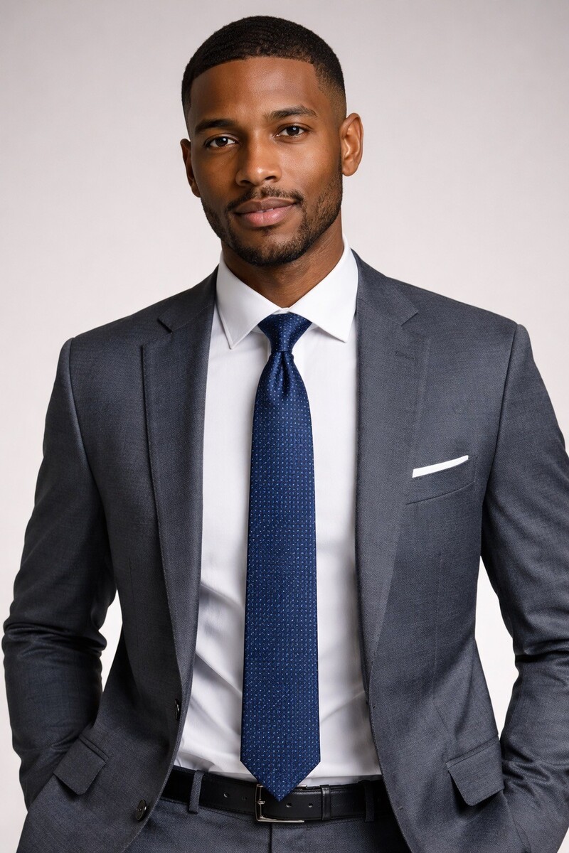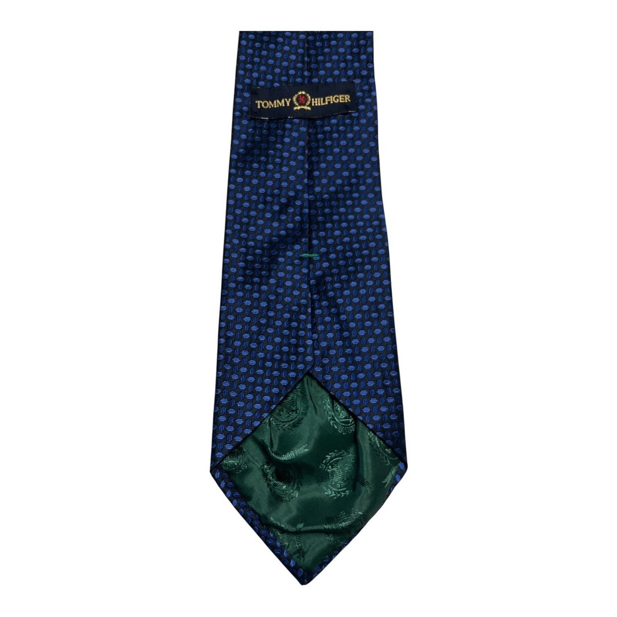 Classic designer necktie featuring a rich navy base with woven geometric dot pattern and a deep green paisley lining. Crafted from 100 percent silk with a refined sheen and timeless width, this Tommy Hilfiger tie is a versatile staple for business, formal events, or elevated everyday wear. Made in the USA from imported fabric.