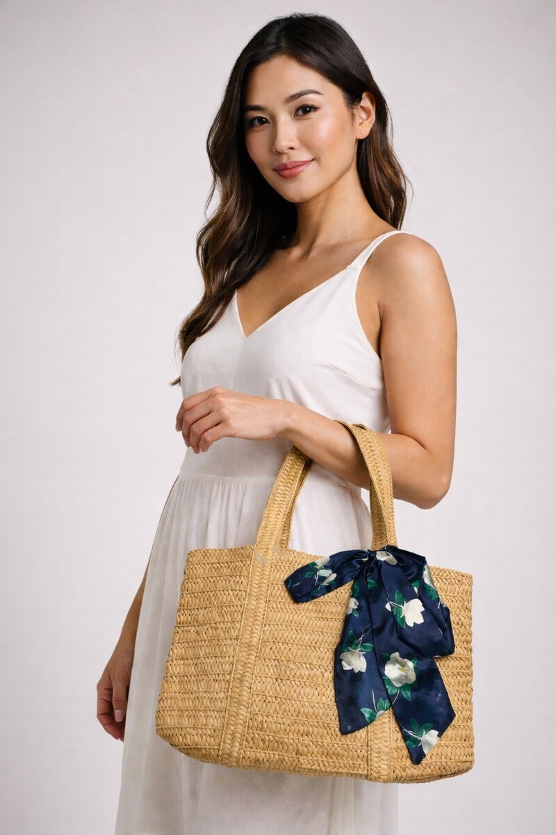 Draper James Woven Straw Tote Bag Magnolia Scarf Large Summer Beach Handbag