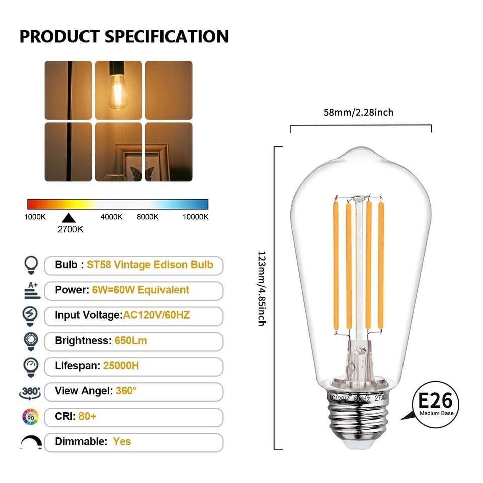 BORT ST58/ST19 Vintage LED Edison Bulbs 6W 2700K Dimmable E26 12-Pack