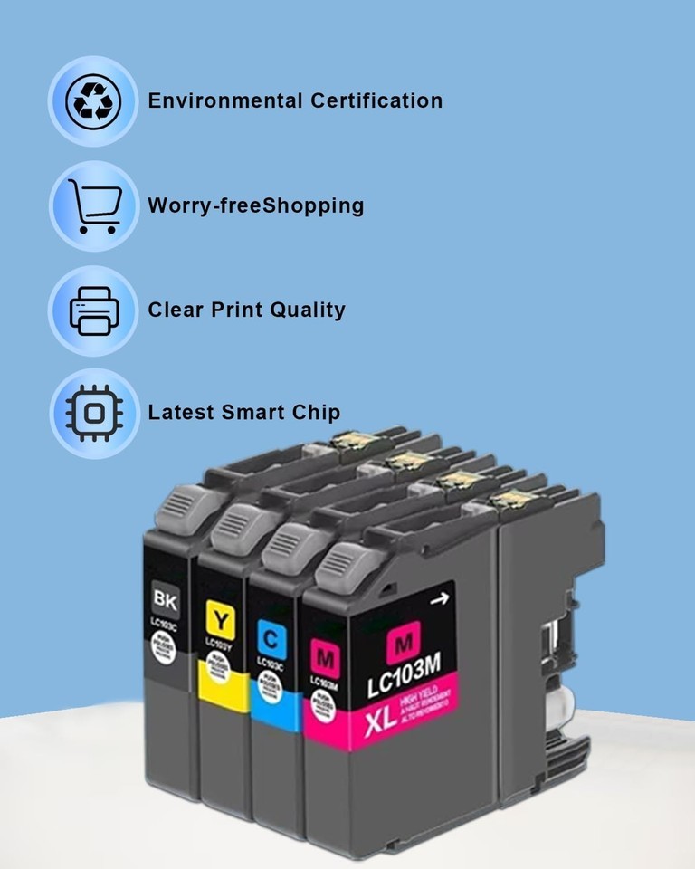 Sealed Package: Prevent High Yield LC103XL Ink Cartridges Leakage. 1 x LC103XL Black, 1 x LC103XL Cyan, 1 x LC103XL Magenta, 1 x LC103 XL Yellow (Total 4-Pack),Compatible Printer: With intelligent chips, lc103 ink cartridges for printer MFC-J870DW MFC-J875DW MFC-J245 MFC-J285DW MFC-J4310DW MFC-J4410DW MFC-J450DW MFC-J4510DW MFC-J4610DW MFC-J470DW MFC-J4710DW MFC-J475DW MFC-J650DW MFC-J6520DW MFC-J6720DW MFC-J6920DW DCP-J132W DCP-J152W DCP-J172W DCP-J4110DW DCP-J552DW DCP-J752DW,High Page Yield: Up to 600 pages per lc103bk xl black ink cartridges, up to 600 pages per lc103cl xl color ink cartridges (at 5% coverage of A4 Paper),Low Cost High Printing: Excellent ink quality, high capacity and extended replacement cycle, saving continuous procurement costs. Easily achieve printing freedom and no longer worry about costs,Professional Printing: It adopts imported quick-drying anti-oxidation ink, which does not clog the head, leak ink. Professional-grade ink, sharp and clear black text, vivid and full color output,Higher quality service: A 12-month extended warranty period allows you to enjoy a more reassuring usage cycle and a quicker and more convenient return and exchange service