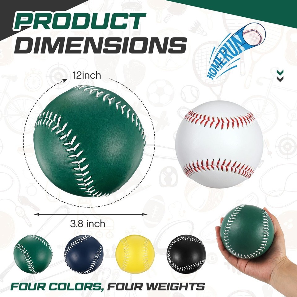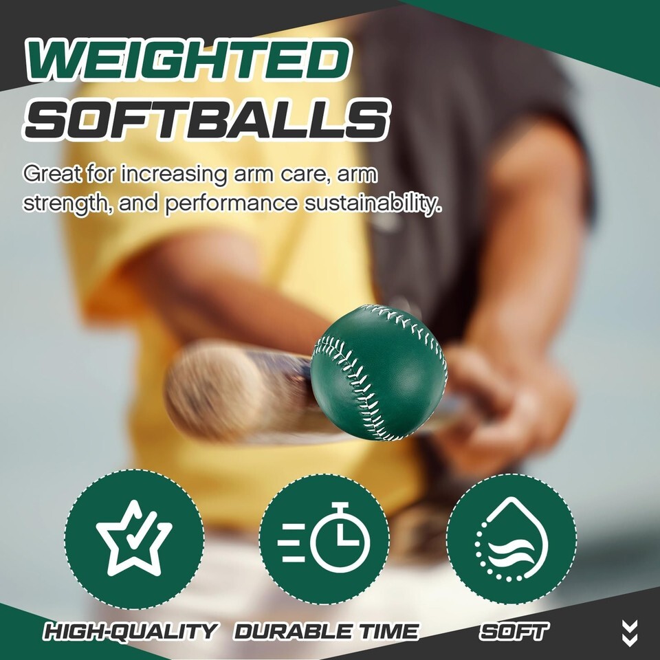 Enough Quantity for Your Training Needs: there are 4 pieces of weighted softballs in the package, meeting your training needs, are ideal for softball sports, also come with 1 drawstring bag, convenient for you to store these softballs when not in use,Different Weighted Balls Meet Different Training Needs: these weighted balls for softball come in 4 different colors, green, blue, yellow and black, which corresponding to 4 different weights, 9, 10, 11 and 12 oz, you can choose the ball according to the practical situations and needs, bringing you an efficient training or playing process,Helpful to Softball Pitching Training: our softball weighted balls can help you build correct pitching and throwing skills and increase arm strength and throwing speed when players pitching and throwing, serving as a useful tool in your daily exercise,Suitable Size and Quality Material: the size of our softball training balls is 12 inches, which can be held well in hand, and these balls are mainly made of PVC wood core, enduring and solid, designed for multiple pitching and throwing, wear resistant, are your long lasting companion for pitching and throwing training,Not Only for One Situation: the weighted hitting balls are versatile, which can be applied for professional sports match, also suitable for daily play, making you don't have to worry about compatibility; Just put yourself in sports totally