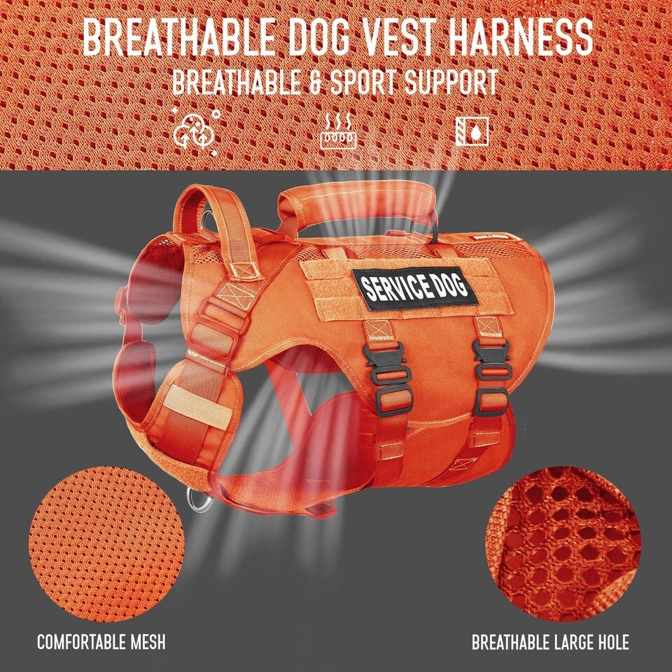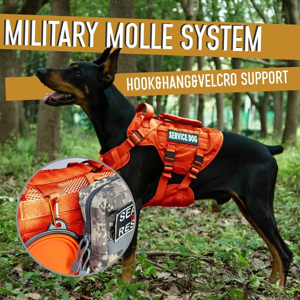 [Soft Mesh]: The inner soft mesh cushion covers the full body to protect your dog's skin. The extra mesh design on top provides more breathable during the outdoor time.,[Lift Support Handle]: A adjustable nylon padded straps fit the medium and large dog. Sturdy dog sling help your furry friends go up and down stairs, get on and out of cars, hiking, and daily working. The soft front handle give your more room and comfort to control your dog.,[Lightweight Metal Buckle]: 4X quick release metal buckles made of 39g from DNALLRINO will be more lightweight and sturdier. Addtionally, designed with 2 metal leash rings for your dog. The front clip to stop your dog from pulling on walking and training. The back clip is good for casual walks, jogging, hiking.,[VELCRO and MOLLE]: Tactical dog vest equipped with Hook and Loop Panel, which allows you to DIY any of your military badge and patches (A "SERVICE DOG" Patch is included for you). The MOLLE system allow your dog to carry GEAR for training, hunting, walking, such as the dog bowl, water bottle, Molle Pouches (No Included).,[Friendly Advice]: The dog vest is a product for dogs to wear, please place the vest away from where the dog can reach to prevent being BITTEN! Please reference to the sizing chart and measure your dog (Especially CHEST AND NECK) before purchase!