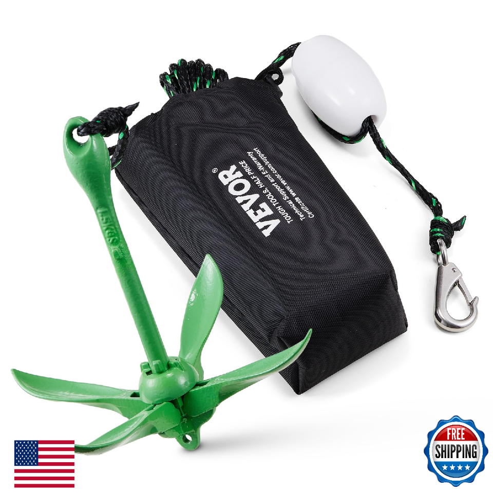 Kayak Anchor Kit: Our kayak anchor kit includes a 3.5 lb kayak anchor, a 26.2 ft/ 8m double-braided marine-grade rope, a buoy, a stainless steel spring hook, and a convenient storage bag, providing hassle-free docking for your vessels. Our paddle board anchor is lightweight and easy to carry; it's a great choice for outdoor water sports players.,Stable Grip in Shallow Waters: Easily deploy the 4-fluke kayak anchor by sliding the collar up, folding the wings, and locking it in place. Designed for shallow waters, it offers excellent horizontal resistance on various terrains, from sandy to rocky bottoms, ensuring secure anchoring for small boats.,Anti-Seawater Corrosion: Crafted from cast iron (KTH300-06) with electroplating and spray coating, our jet ski anchor withstands harsh marine environments, remaining durable, impact-resistant, and corrosion-resistant in river and seawater, ensuring long-lasting performance.,Folding Boat Anchor: Compact and foldable, our 3.5 lb 4-fluke boat anchor folds to a compact size of 12" x 3", making it easy to store and transport with the included storage bag. Lightweight and versatile, it's ideal for SUP yoga, motorboat anchoring, kayak fishing, and more.,Wide Applications: Our paddle board anchor kit is suitable for a variety of small human-powered boats, including rowboats, canoes, inflatable boats, kayaks, and paddleboards, providing essential stability and security for your outdoor water adventures.