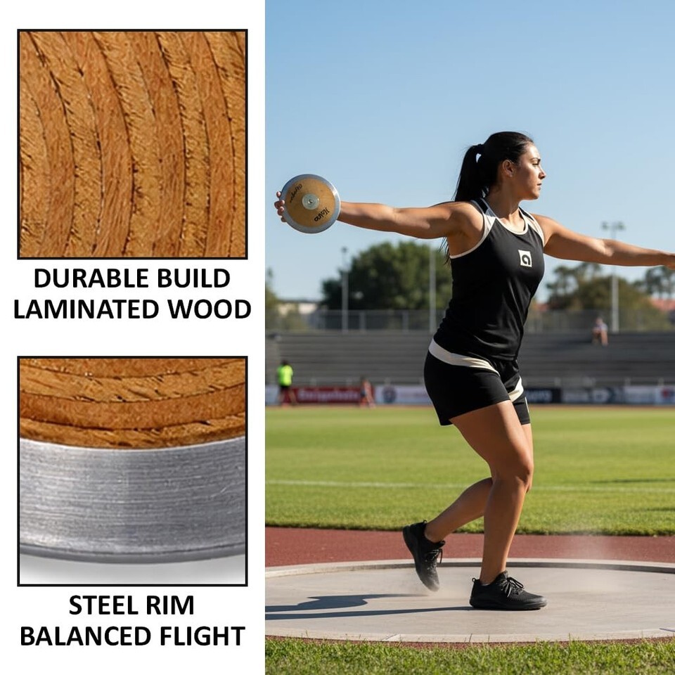 . Economy wood discus with steel rim . Ideal for competition as well as practice. 60-70% rim weight .