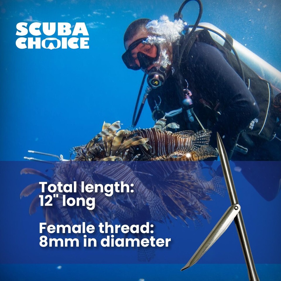 Scuba Choice Spearfishing 12" Stainless Steel Pole Spear Tip Single Barb Head a Durable Replacement Tip for Fiberglass and Carbon Fiber Pole Spears Enhance your spearfishing gear with the Scuba Choice 12" Stainless Steel Pole Spear Tip. Made from high-quality stainless steel, this durable tip is the perfect replacement for damaged tips, offering precision and reliability for both beginners and experienced spearfishers. The single barb design ensures secure catches, while the corrosion-resistant stainless steel stands up to saltwater conditions. The 8mm female thread guarantees a secure fit with fiberglass and carbon fiber poles. Note: Not compatible with aluminum 3-piece pole spears. Easy to install and lightweight, this spear tip provides a dependable solution for spearfishing in various environments. Trust Scuba Choice to offer premium gear built for durability and performance. With over 30 years of experience, Scuba Choice has been a leader in the scuba diving industry since 2011, providing top-quality spearfishing and diving accessories. Enjoy reliable equipment and great customer satisfaction with Scuba Choice.