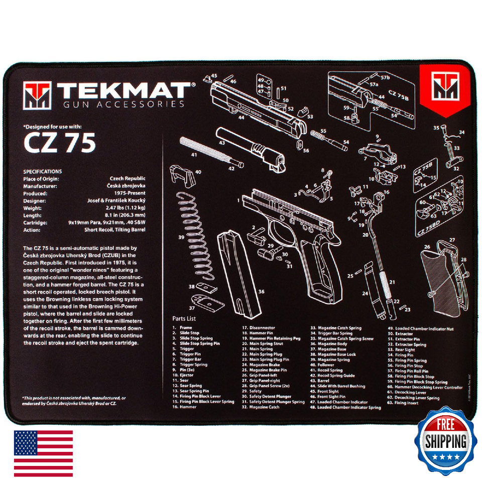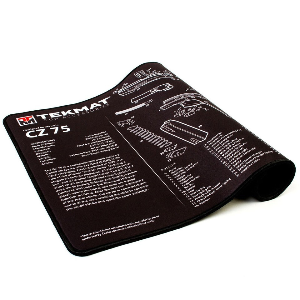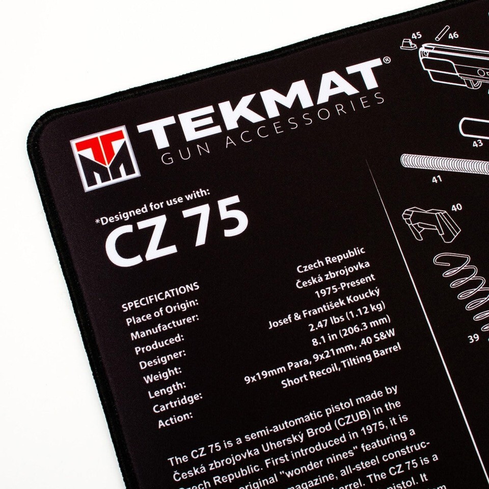TEKMAT ULTRA 20 PREMIUM HANDGUN CLEANING MAT FOR USE WITH CZ 75: TekMat created the original printed cleaning and maintenance mat and with the new Ultra line of Premium TekMats, you get the same quality and durability as the original TekMat but with more space, thicker padding, and a premium stitched edge. The Ultra 20 cleaning mat is large enough to handle a fully disassembled handgun with room to spare for tools and accessories. The extra thick .25" padding not only provides a premium feel and high level of quality but it offers extra protection from any rough handling or drops while working on your handgun. The ultra-soft, oil and water-resistant surface helps protect your gun from scratches while the diagrams and illustrations help with cleaning, disassembly and are just plain fun to look at. MAIN FEATURES: - Original schematic gun pattern; - 1/4" Thickness; - CZ 75 Parts List; - Dimensions: 15" X 20"; - Dye Sublimation Printing will not scratch off or fade; - Oil solvent resistant; - Non-slip backing will keep everything in place; - Waterproof and easy to clean; - Surface Protection; - Stitched Edges.