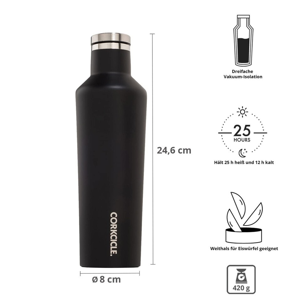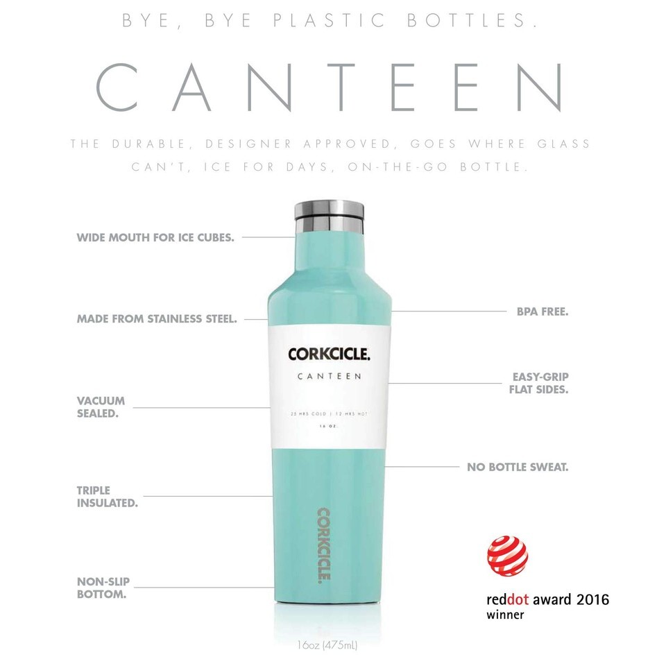 Keep your hot or cold beverage ready for the day in the CORKCICLE. 16oz Canteen water bottle.,Cool for twenty-five hours, hot for twelve.,Triple insulated water bottle with easy-grip, flat sides.,Stay-put silicone bottom.,Wide mouth fits ice cubes.