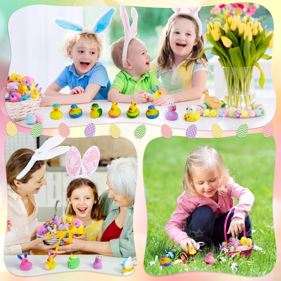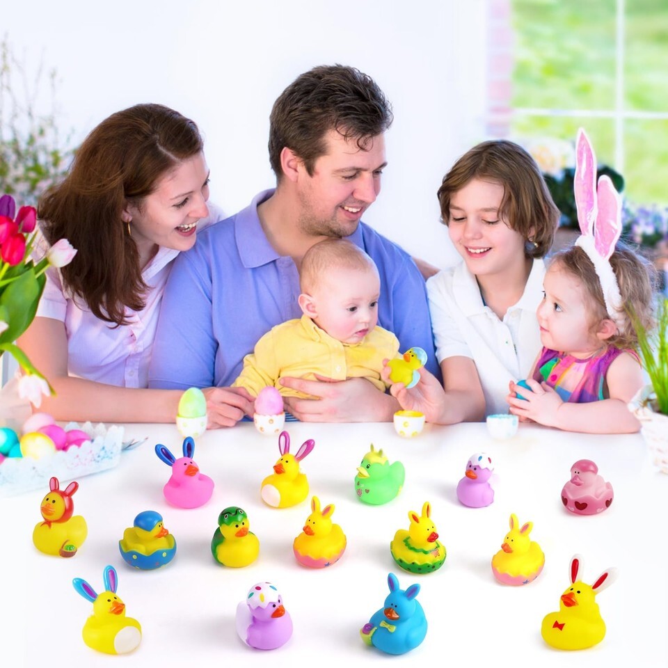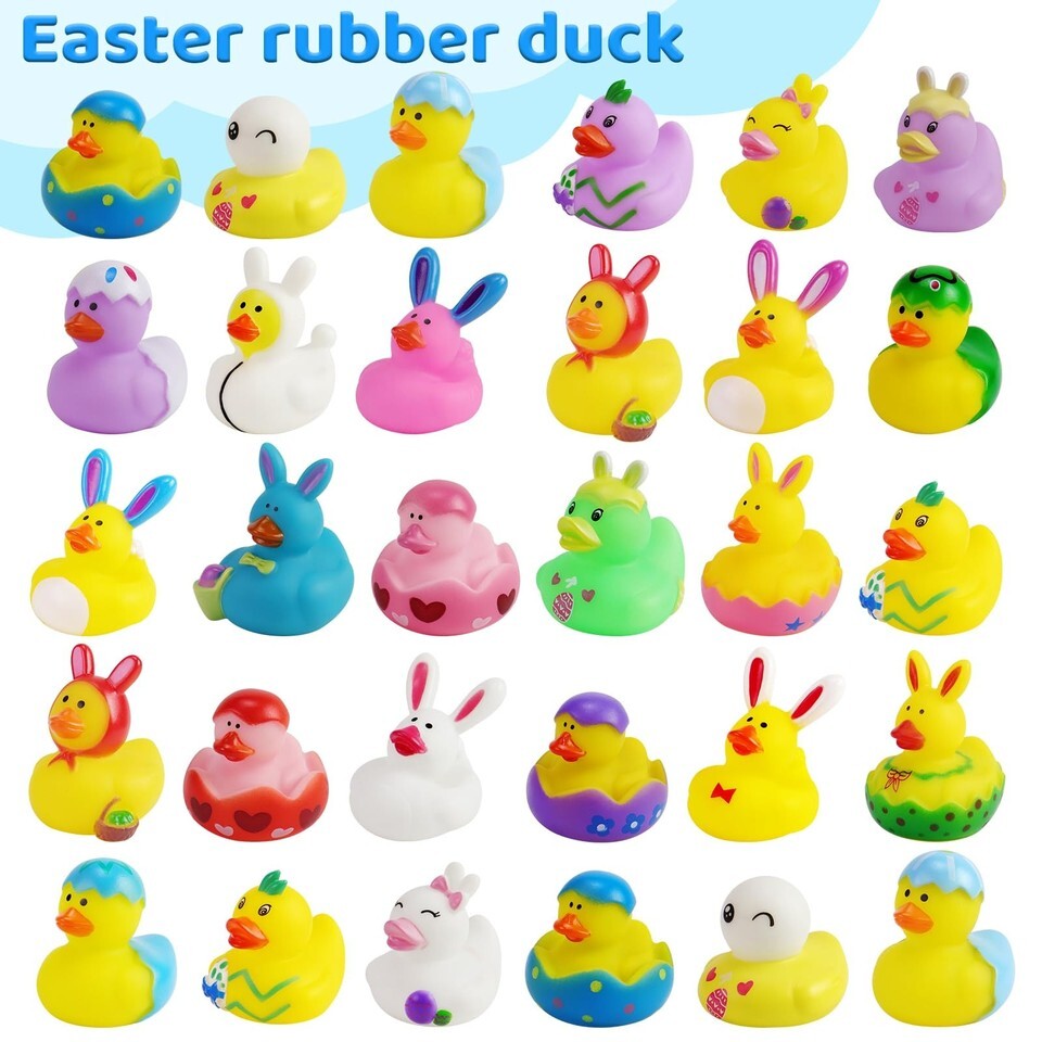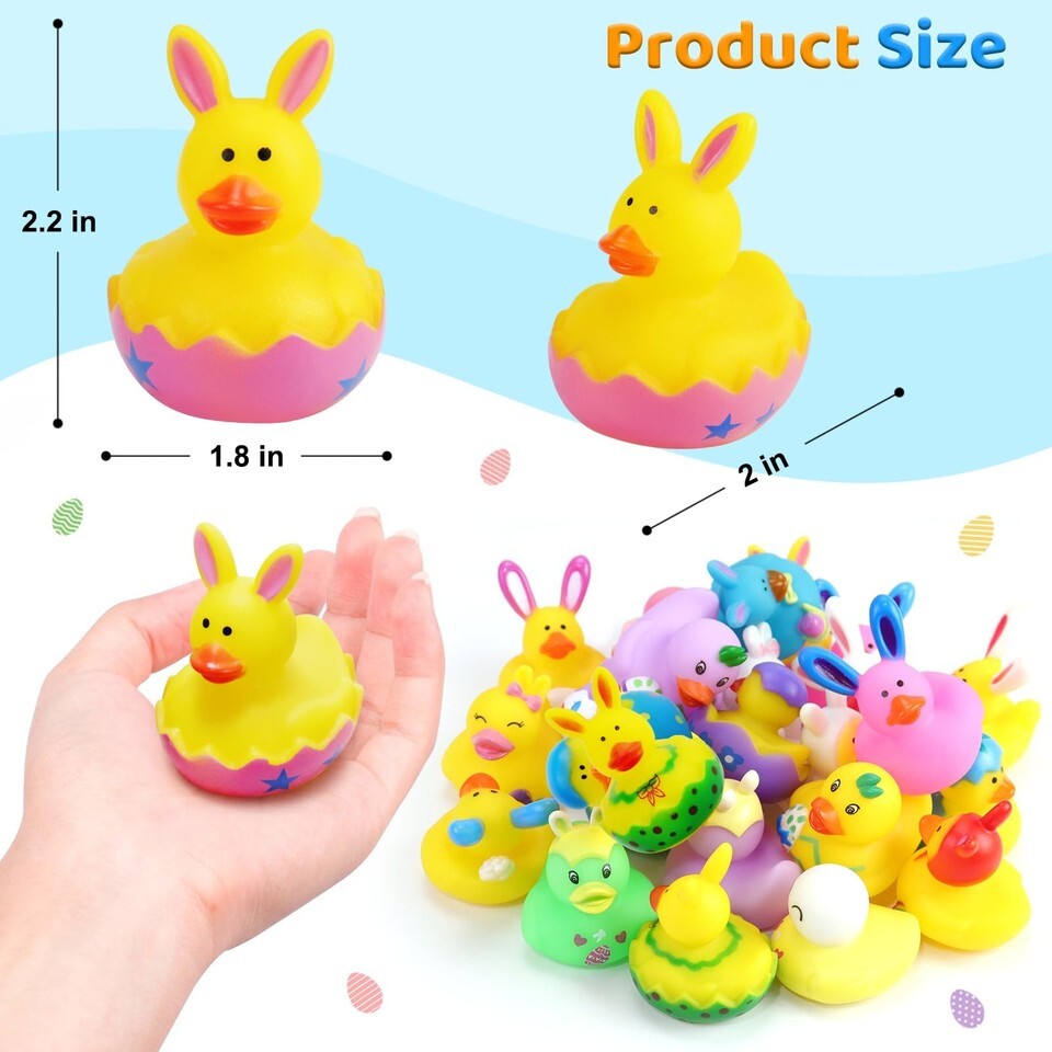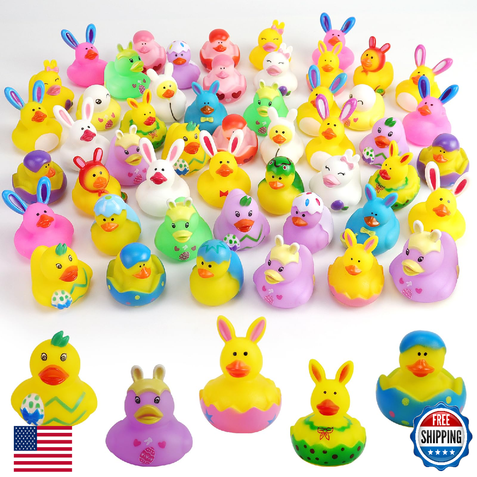 Super Value Rubber Duckies: Our Easter rubber ducks with 27 different Easter themed styles (2 of each, there are 4 are separate), such as bunny ducks, egg ducks, etc. Each measures about 2.1 inches, with a total of 50 ducks.,Safe Material: The rubber ducks are made of safe and non-toxic rubber material, the surface is smooth and soft, it's easy to clean, kids can play it with confidence.,Easter Themed Design: Rubber ducks are designed with Easter theme, each duck is matched with Easter eggs, rabbits, flowers and other elements, full of Easter flavor, which can be shared with friends, family, classmates, neighbors and so on.,Perfect Gift for Easter Party: The rubber duck set is perfect for Easter basket stuffers, Easter egg hunt events, birthdays, Easter party favors, Easter party decorations, game prizes, bath toys and more to add a festive atmosphere.,?Suitable Size?Each rubber duck is about 2 inches in size, just the right size for children to exercise their grasping ability, small and flexible, and easy to carry.