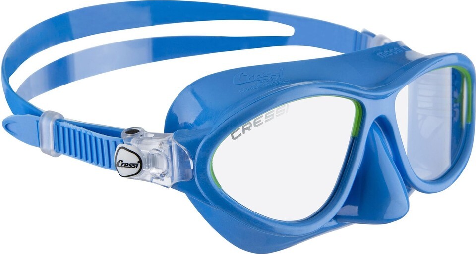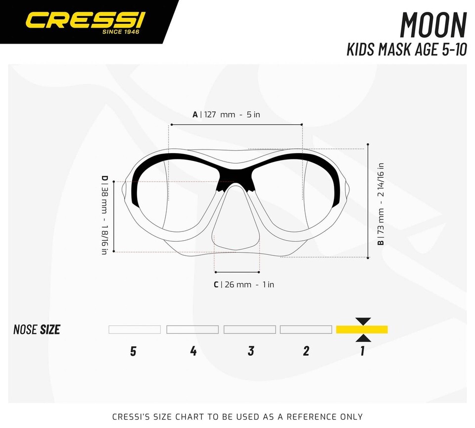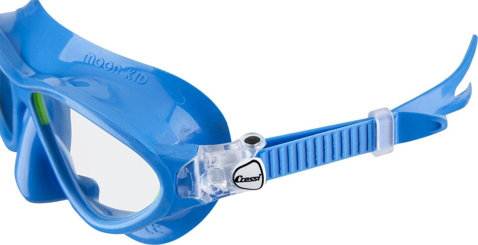 The Moon is a small mask suitable for children around 7 to 15 years old. The mask is more comfortable, compared to the traditional swim goggles, and is ideal for the swimming pool, or even in the sea with a snorkel.The two lenses have a design that follows the natural shape of the face increasing drastically the field of view. They are made with anti-scratch and anti-fog treatment. They also protect the eyes against dangerous UV sun rays.The skirt is made of hypoallergenic TPR, a soft material that ensures comfort. The front frame is made of very flexible plastic and, in combination with the TPR, the mask ensures a perfect seal and adapts at most shape faces.The nose pocket is easy-to-reach for ear equalization if the child swims below the surface of the water.The buckles are the same used in the Cressi premium scuba diving mask and allow the user to adjust the strap length easily without effort.The Moon is designed and manufactured in Italy by Cressi, a brand pioneer in scuba diving, snorkeling, and swimming equipment since 1946.The product is covered by a 2-year limited warranty.