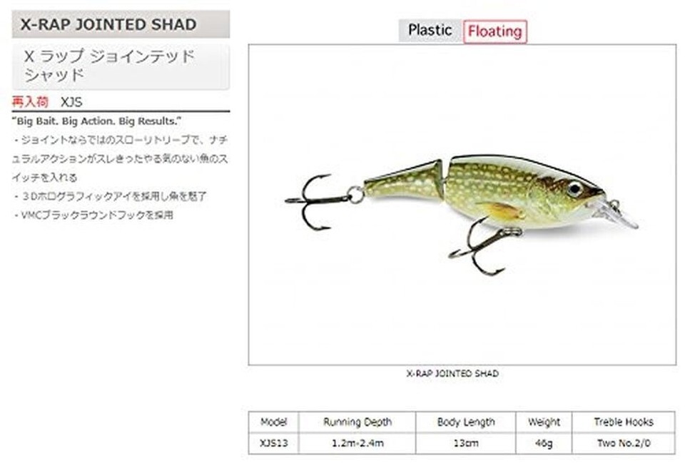 Product Description Rapala XJS13P X-Rap Jointed Shad 13 Perch From the Manufacturer The exaggerated action of the jointed body allows a slower retrieve to trigger sluggish or finicky fish. Near neutral buoyancy, with a slight rise, provides a very natural "wounded-minnow" action. Combine it with the X-Rap finish, and no fish is safe.
