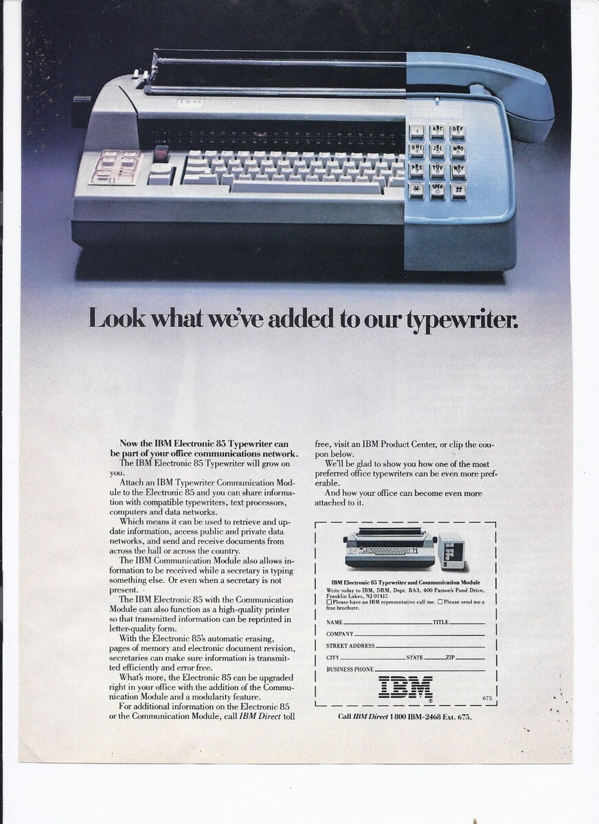1983 IBM Electronic 85 Typewriter and Communication Module Print Ad 8.5" x 11"