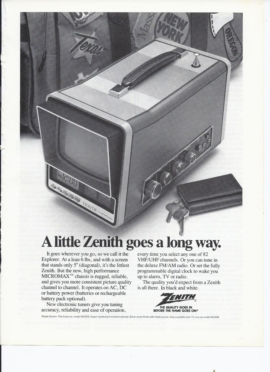 1983 Zenith The Explorer Portable TV and Radio Print Ad Vintage 8.5" x 11"