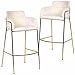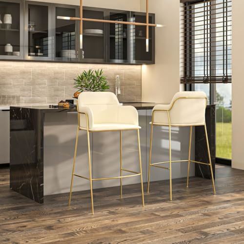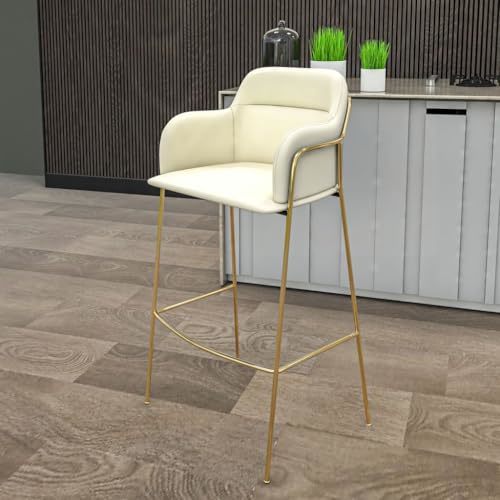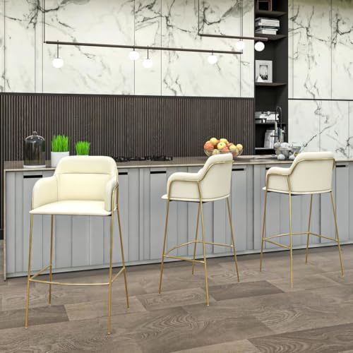Product description: The LeisureMod Axis Collection Bar Height Chairs bring a clean, modern look to any kitchen island, home bar, or counter space. Featuring a soft beige upholstered seat paired with a sleek gold metal frame, these bar stools add a stylish touch while keeping the design simple and elegant. The padded seat and curved backrest with built-in armrests provide comfortable support, making them ideal for daily meals, casual gatherings, or entertaining guests. Designed at bar height, each chair includes a sturdy footrest for added convenience and relaxed seating. The strong metal frame ensures stability and durability, while the open design keeps your space feeling light and uncluttered. Perfect for modern kitchens, dining areas, apartments, or lounge spaces, this Set of 2 in Beige offers both practical seating and a refined contemporary look.