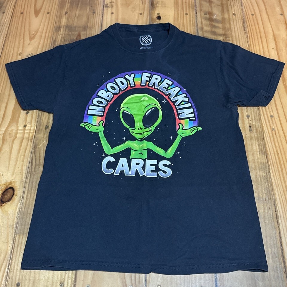 DOM Men's T-Shirt Size M Alien Nobody Freakin' Cares Rainbow Black