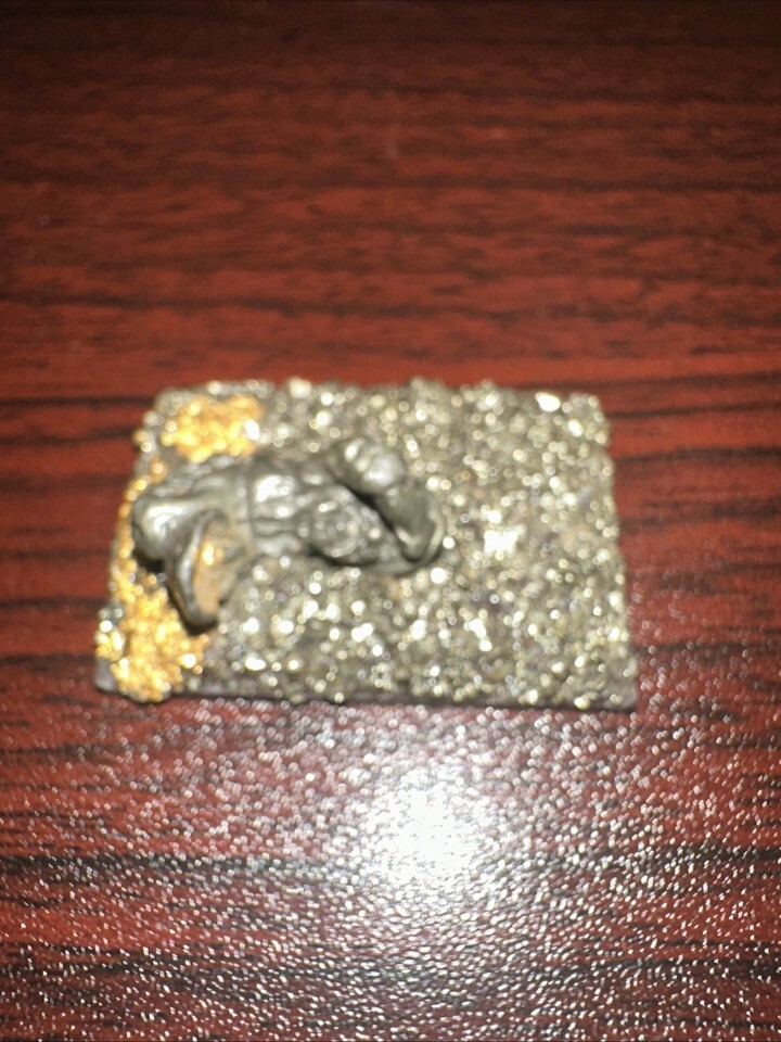 The Prospector Panning for Gold Magnet is a unique collectible piece made of pewter, featuring a tiny figurine of a prospector on a magnet. Handmade with attention to detail, this item is adorned with gold leaf and pyrite (fools gold), adding an element of realism to the design. This one-of-a-kind piece would make a great addition to any metalware or collectibles collection, showcasing the artistry and craftsmanship of the prospector figurine on a magnetic base.