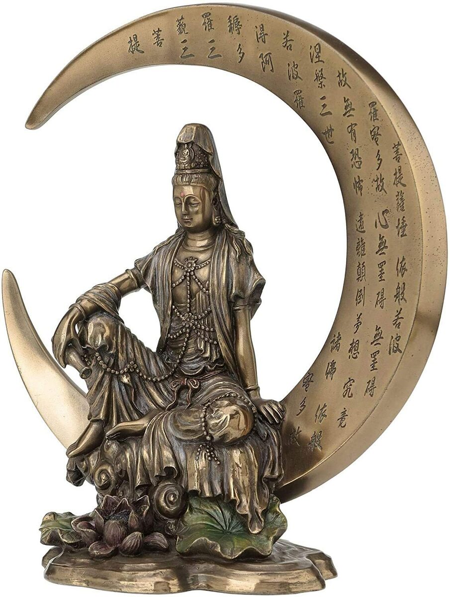 Revered in Asia and across the world, Kwan Yin is a powerful female goddess. She symbolizes compassion ? mercy ? and kindness. This Kwan Yin is depicted in a burnished old bronze finish ? which adds depth and sophistication to the design. Sculpted cold cast bronze with bronze powder mixed with resin the figure is hand-painted to give it an antique look. The moon is a key element of this design, and is a cherished symbol of Chinese culture and mythology. The moon symbolizes family unity. Each year, China celebrates the Mid-Autumn Moon Festival with family reunions. Part of the Heart Sutra is engraved on the front and back of the moon which is "The Heart of the Perfection of Wisdom". The Sutra famously states, "Form is emptiness, emptiness is form."