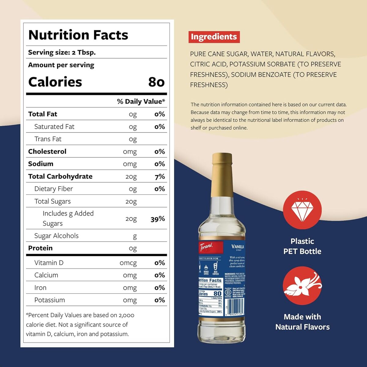 Enjoy the rich, smooth flavor of classic vanilla in your favorite drinks and desserts. Torani Vanilla Syrup delivers balanced sweetness and a warm, creamy aroma that enhances both beverages and sweet treats, bringing a comforting, familiar taste to every pour.