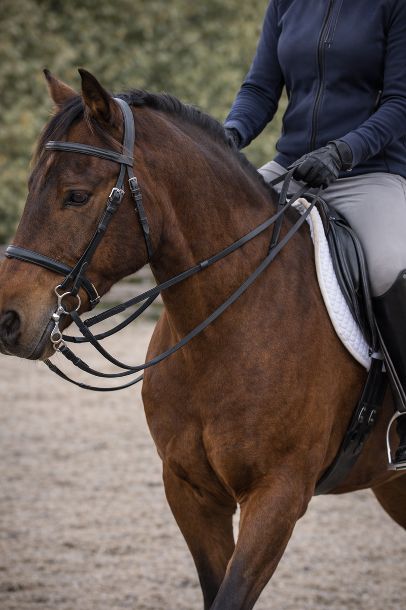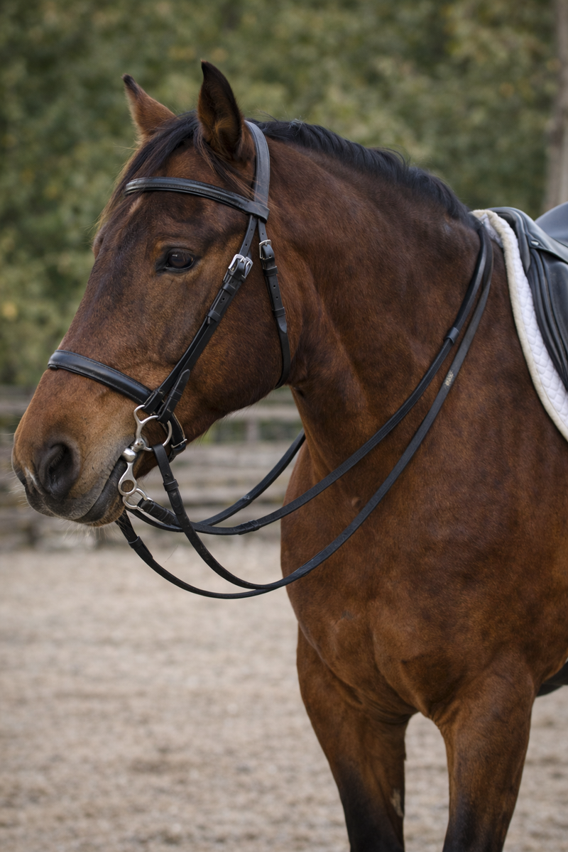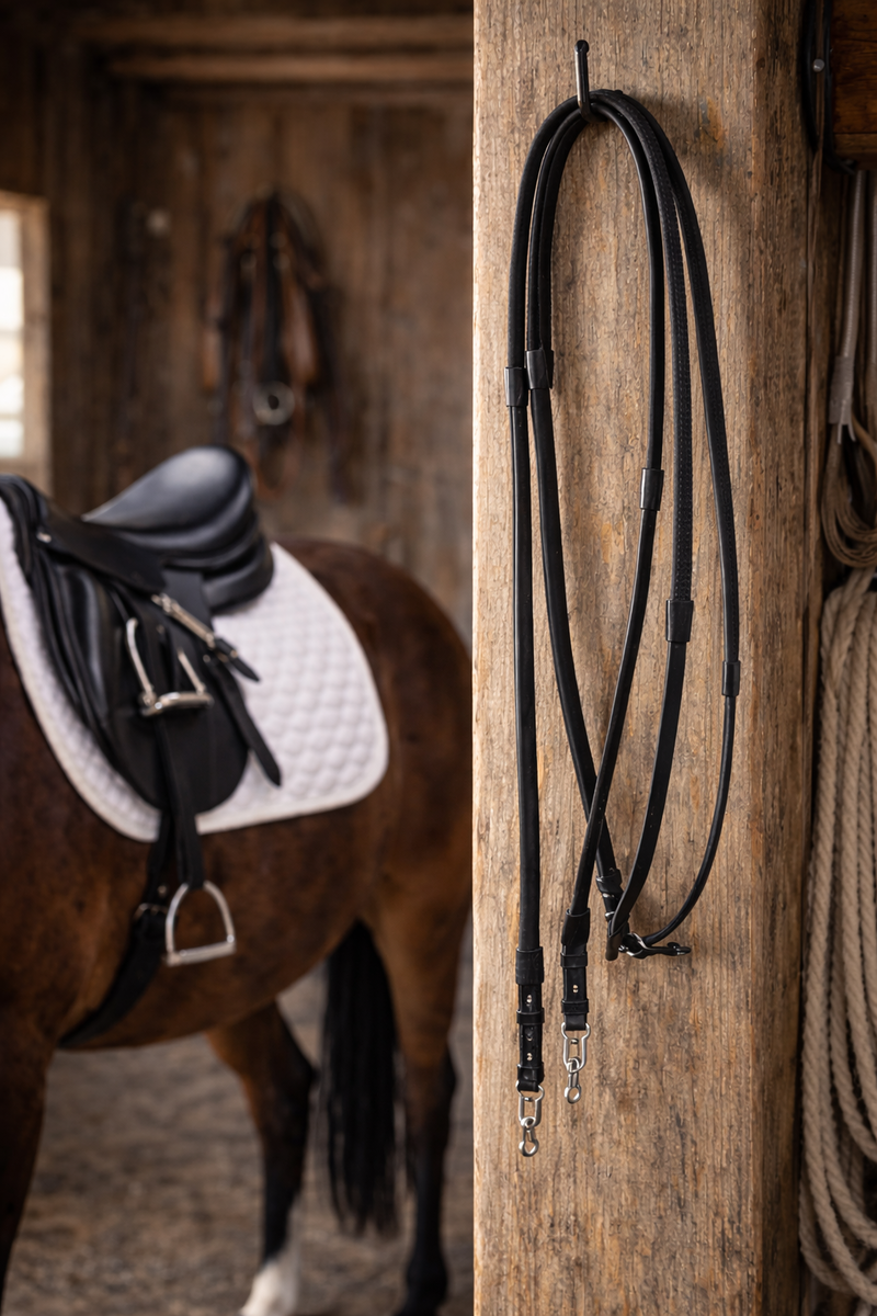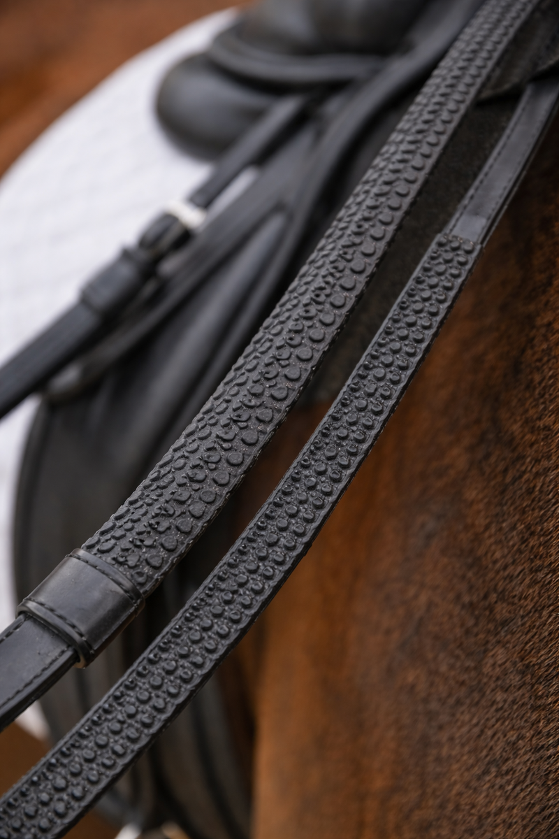 Challenger English black leather reins are made from fine, supple leather and quality rubber raised grips. Rubber grip helps prevent slippage, providing a more secure feel in your hands. Features rust-free stainless steel hardware. Hook stud bit ends. Measures 54" (Full) long x 5/8" wide.