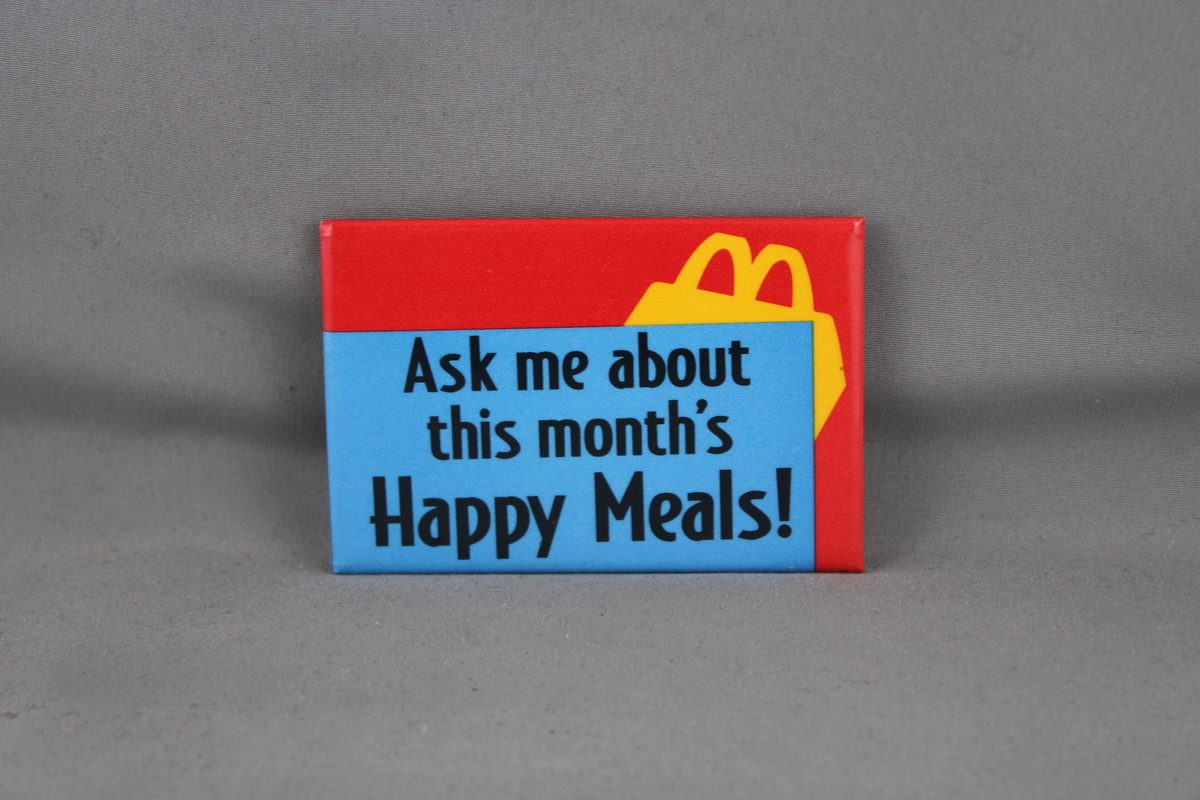 Up for sale is a vintage McDonald's pin. It has a red base colour with a blue box that has ask me about this month's Happy Meal screened on inside it. What a great pin do not miss out on it.